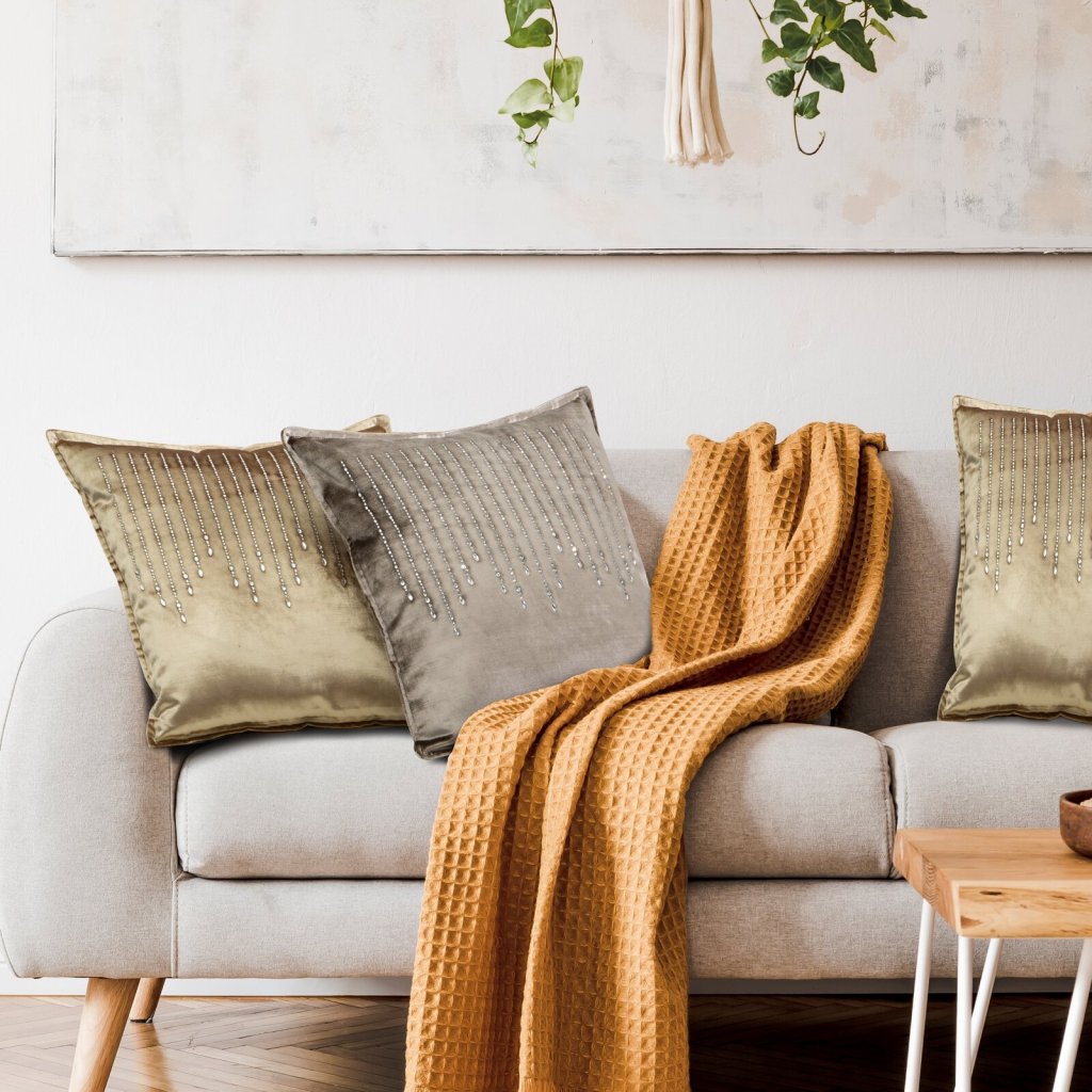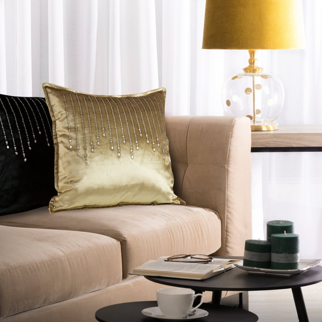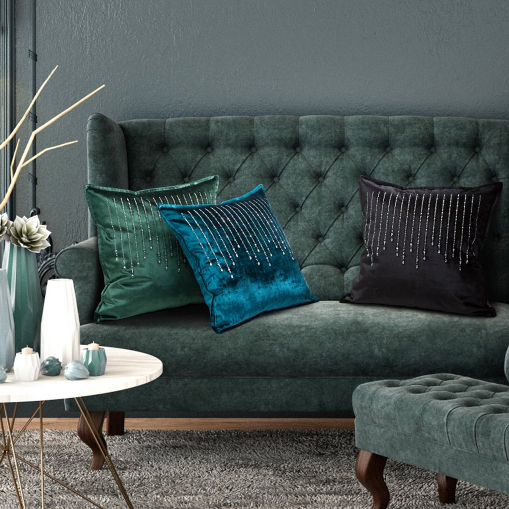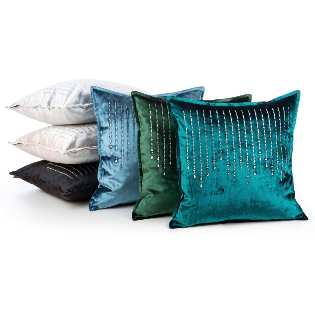 Sametový dekorační povlak na polštář zdobený malými krystaly. Šířka: 45 cm, délka: 45 cm, barva: modrá, hmotnost: 340 GSM, složení: 100 % polyester.Doplňkové parametry