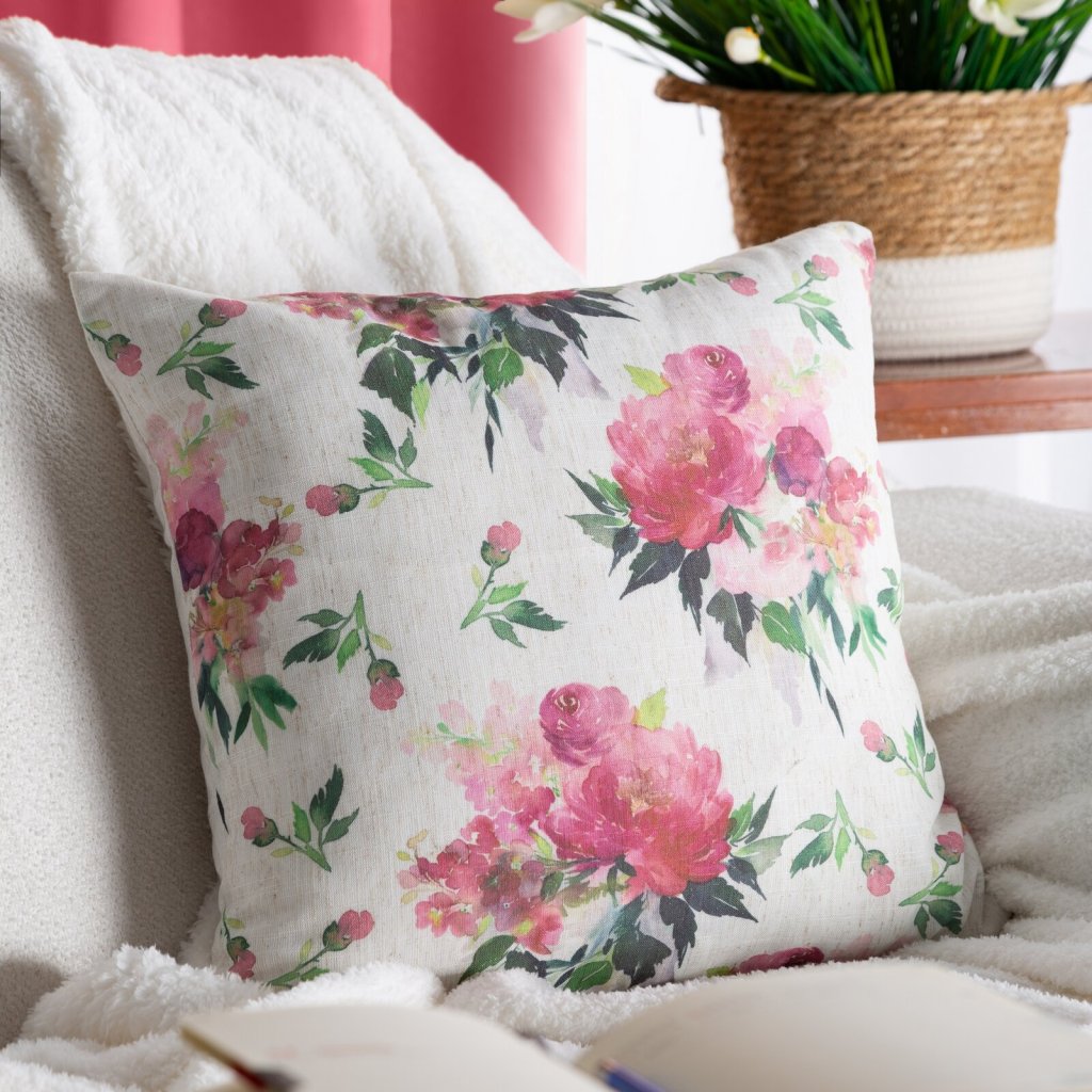 Povlak na polštář z látky se strukturou lnu a potiskem květin, šířka: 45 cm, délka: 45 cm, barva: vícebarevná, hmotnost: 140 GSM, složení: 100% polyester.Doplňkové parametry