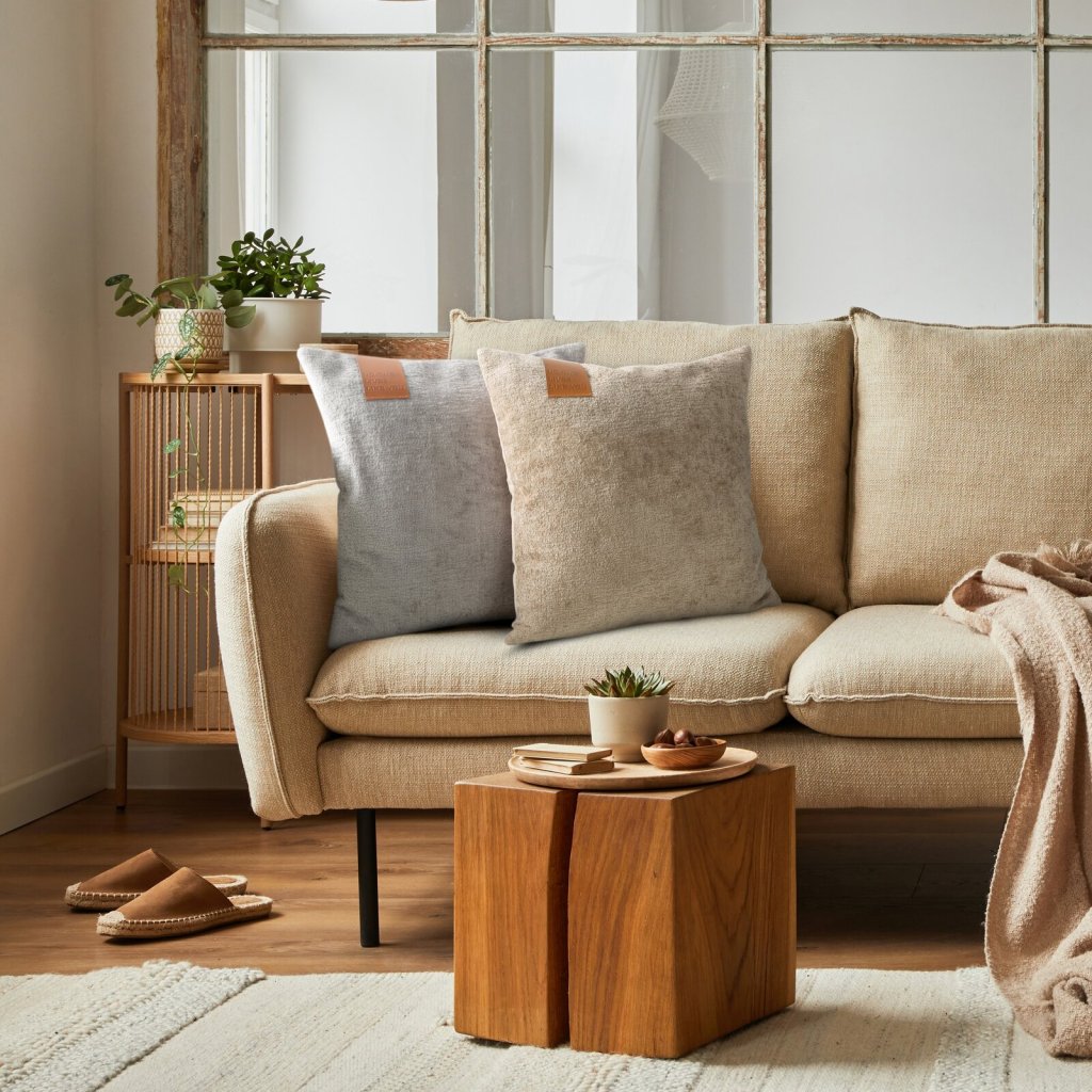 Dekorační povlak na polštář s koženou vložkou, barva: béžová, šířka: 45 cm, délka: 45 cm, složení: 70 % polyester 30 % bavlna.Doplňkové parametry