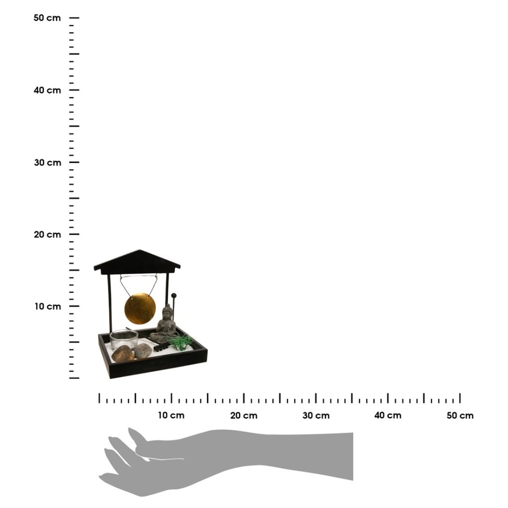 Set v elegantních odstínech béžové a černé obsahuje sošku Buddhy, miniaturní gong, dekorační rostlinku a svícen na čajovou svíčku . Všechny prvky jsou umístěny v kompozici připomínající zenový mini-záhon s jemným pískem, kamínky a dřevěnými hrabličkami . Tento harmonický doplněk krásně vynikne v ložnici nebo obýváku a vytvoří klidnou atmosféru , ideální k odpočinku. Díky svému smysluplnému provedení je také originálním tipem na dárek .