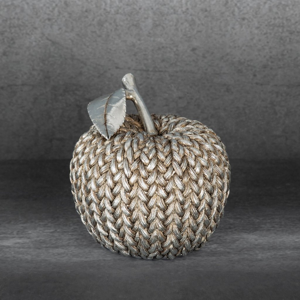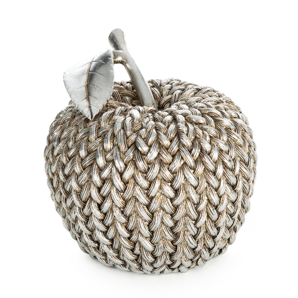 Dekorativní figurka MOLI ve tvaru jablka z polyesterové pryskyřice je stylový a originální dekorativní prvek, který upoutá pozornost svou jedinečnou strukturou. Celý povrch jablka je zdoben vzorem imitujícím tkaný svetr, který mu dodává hřejivý a útulný charakter. Šířka: 13 cm, délka: 13 cm, výška: 13 cm, barva: stříbrná, složení: 100% polyesterová pryskyřice.Doplňkové parametry