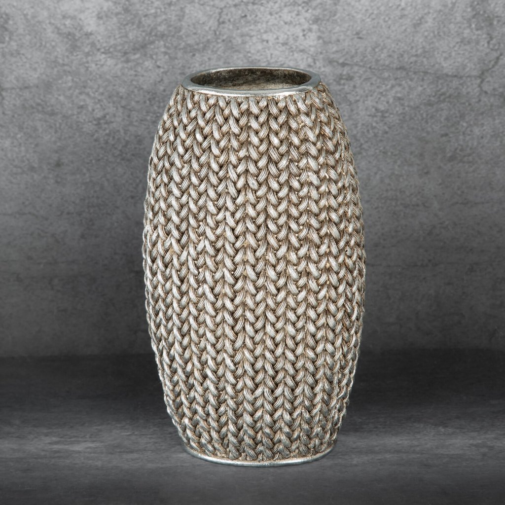 Váza MOLI z polyesterové pryskyřice je originální dekorativní prvek, který potěší svou neobvyklou strukturou. Celý její povrch zdobí vzor připomínající tkaný svetr, který jí dodává útulný a jedinečný charakter. Šířka: 12 cm, délka: 16 cm, výška: 27 cm, barva: stříbrná, složení: 100% polyesterová pryskyřice.Doplňkové parametry