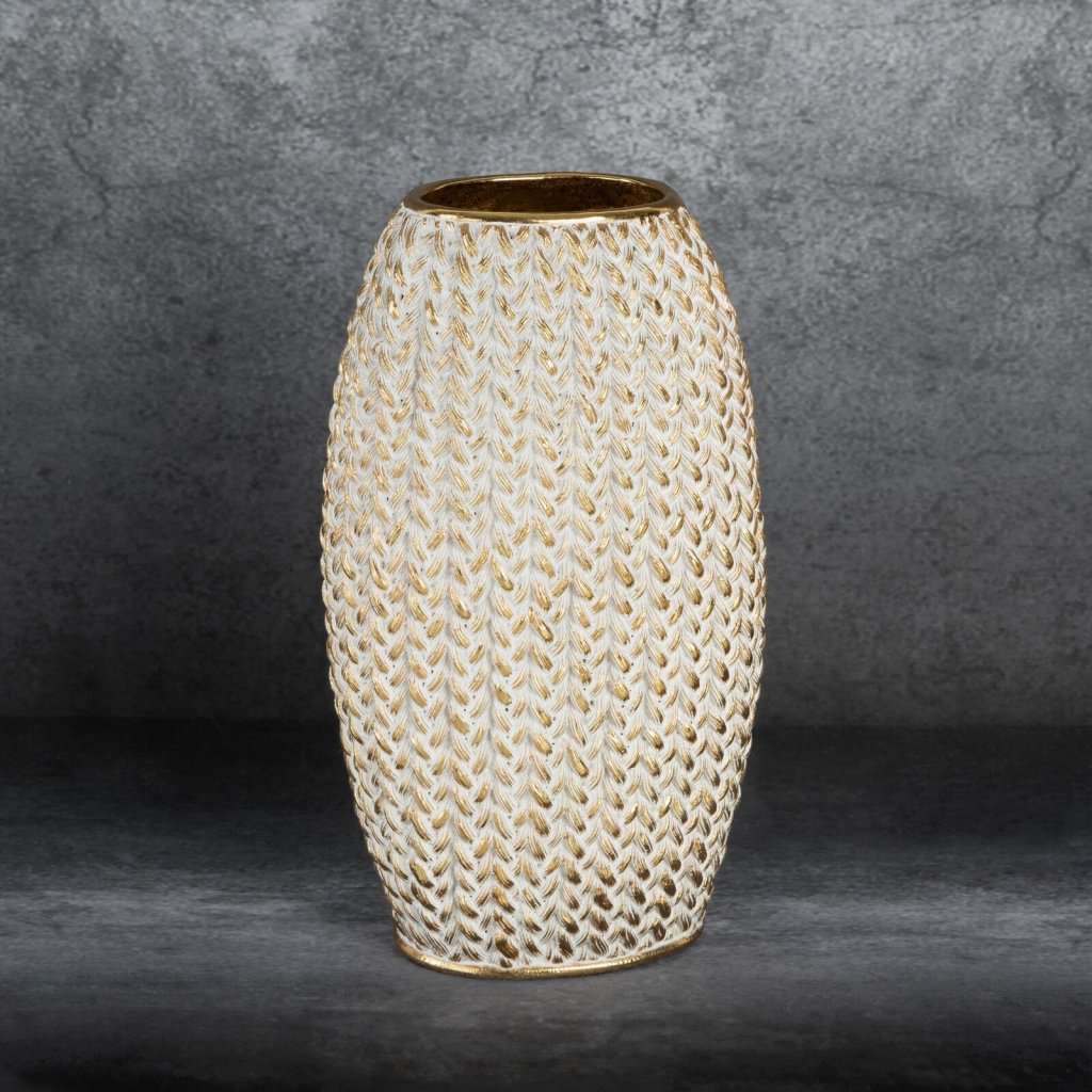 Váza MOLI z polyesterové pryskyřice je originální dekorativní prvek, který potěší svou neobvyklou strukturou. Celý její povrch zdobí vzor připomínající tkaný svetr, který jí dodává útulný a jedinečný charakter. Šířka: 12 cm, délka: 16 cm, výška: 27 cm, barva: zlatá, složení: 100% polyesterová pryskyřice.Doplňkové parametry