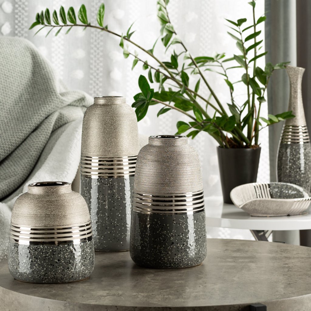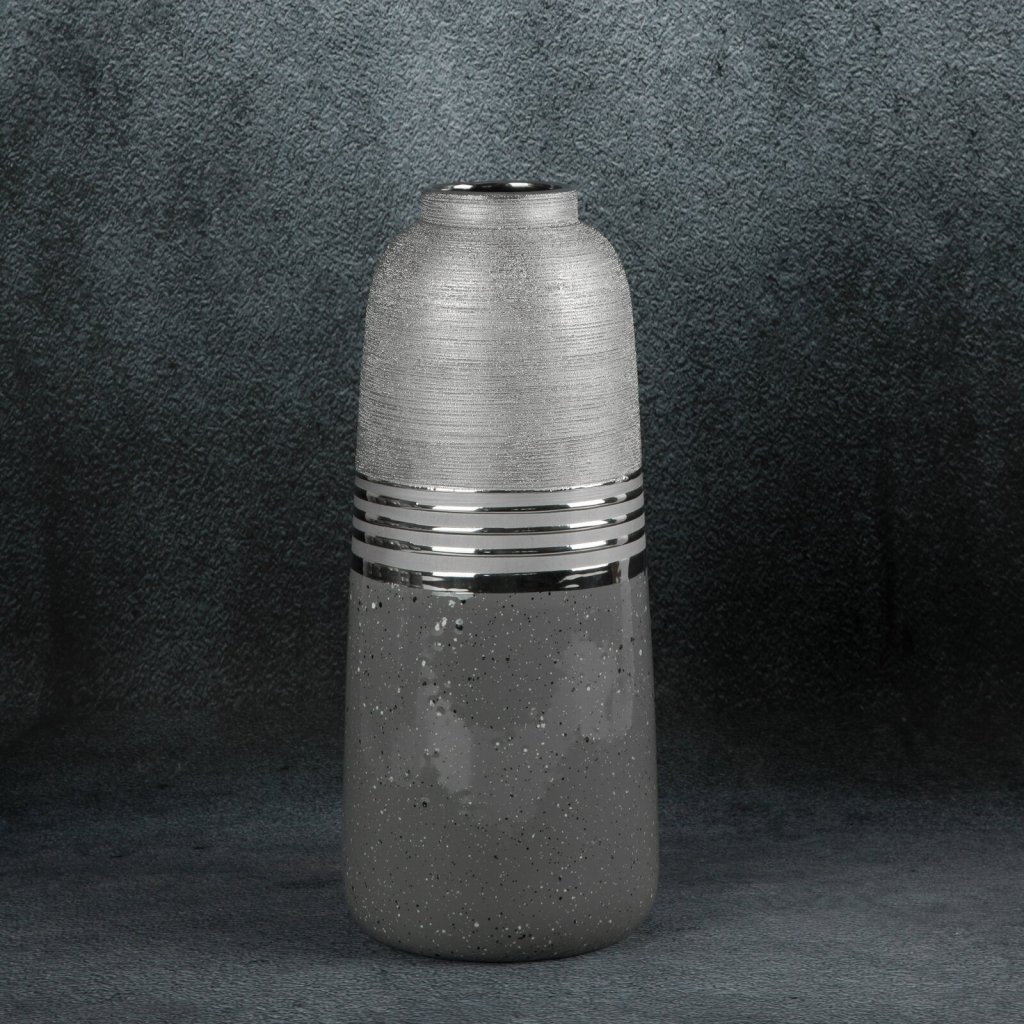 Dekorativní váza, šířka: (fi) 15 cm, délka: 36 cm, barva: stříbrná, složení: keramická hlína.Doplňkové parametry