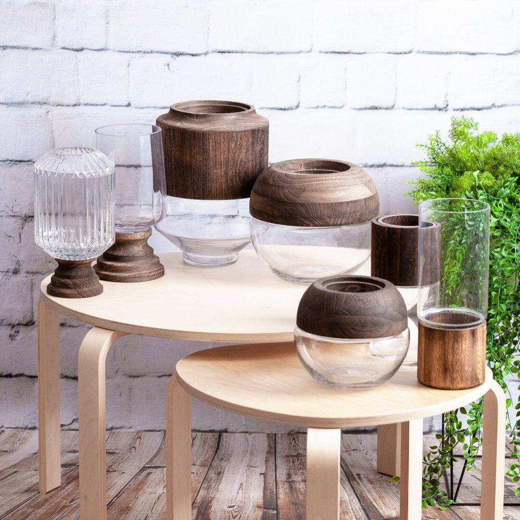 Dekorativní svícen šířka: (fi) 17 cm, délka: 34 cm, barva: bílá / hnědá, složení: 70 % sklo; 30 % dřevoDoplňkové parametry