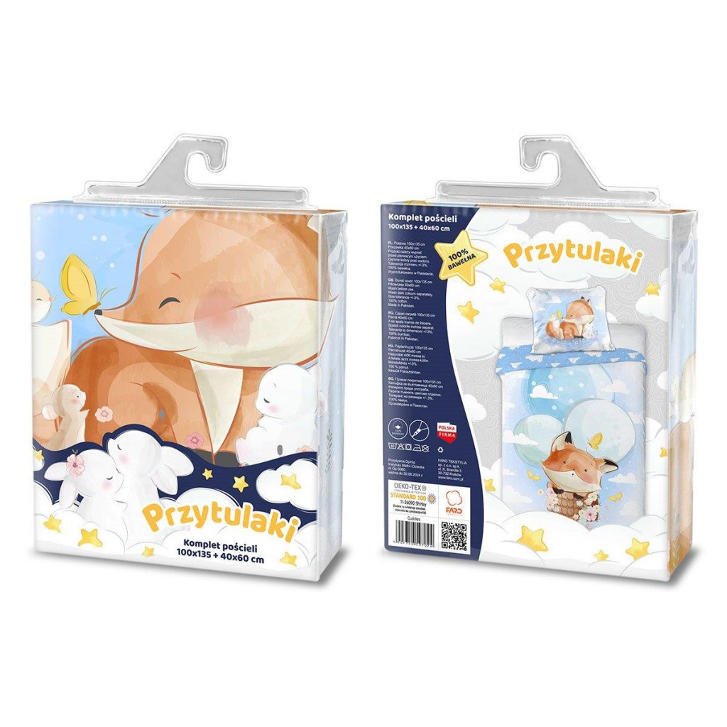 Originální dvoudílné dětské povlečení s potiskem lišky. Složení: 100% bavlna. Rozměry: 100x135+1x 40x60 cm. Praní: 40 °C. Zapínání na zip. Balení. Barvy na obrázcích se mohou mírně lišit od skutečnosti.Doplňkové parametry
