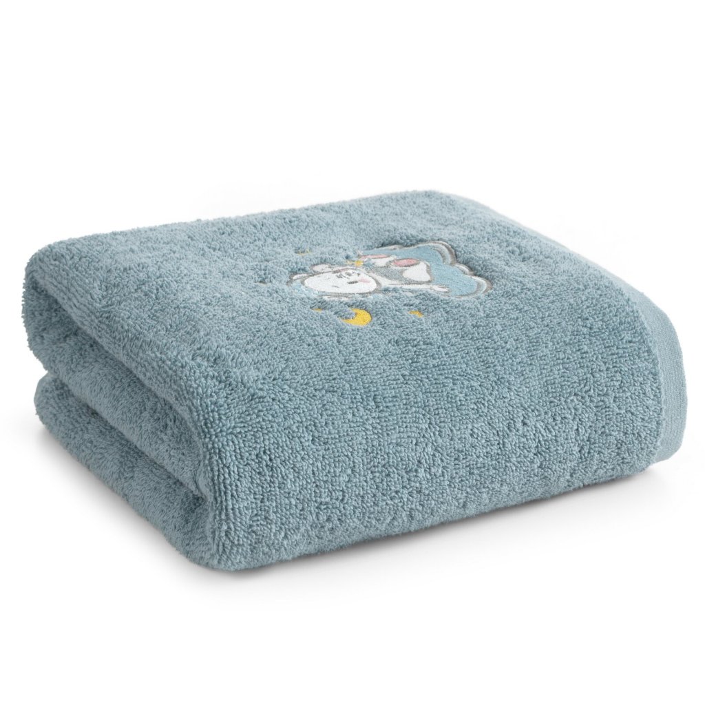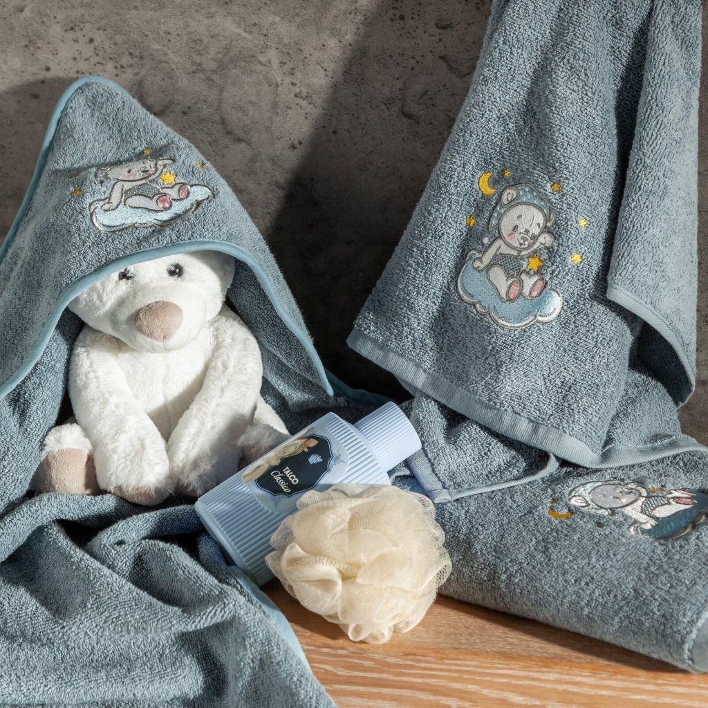Bavlněná dětská osuška s aplikací medvídka je měkká, savá a neuvěřitelně jemná na dotek, je ideální volbou pro každodenní péči o dítě. Díky pastelově modré barvě a roztomilému motivu medvídka je tato osuška praktickým i estetickým doplňkem koupelny vašeho dítěte. Výrobek má certifikát OEKO-TEX® Standard 100, který potvrzuje jeho bezpečnost a nepřítomnost škodlivých látek, což je ideální pro citlivou dětskou pokožku. Šířka: 50 cm, délka: 90 cm, barva: světle modrá, hmotnost: 450 GSM, složení: 100% bavlna.Doplňkové parametry