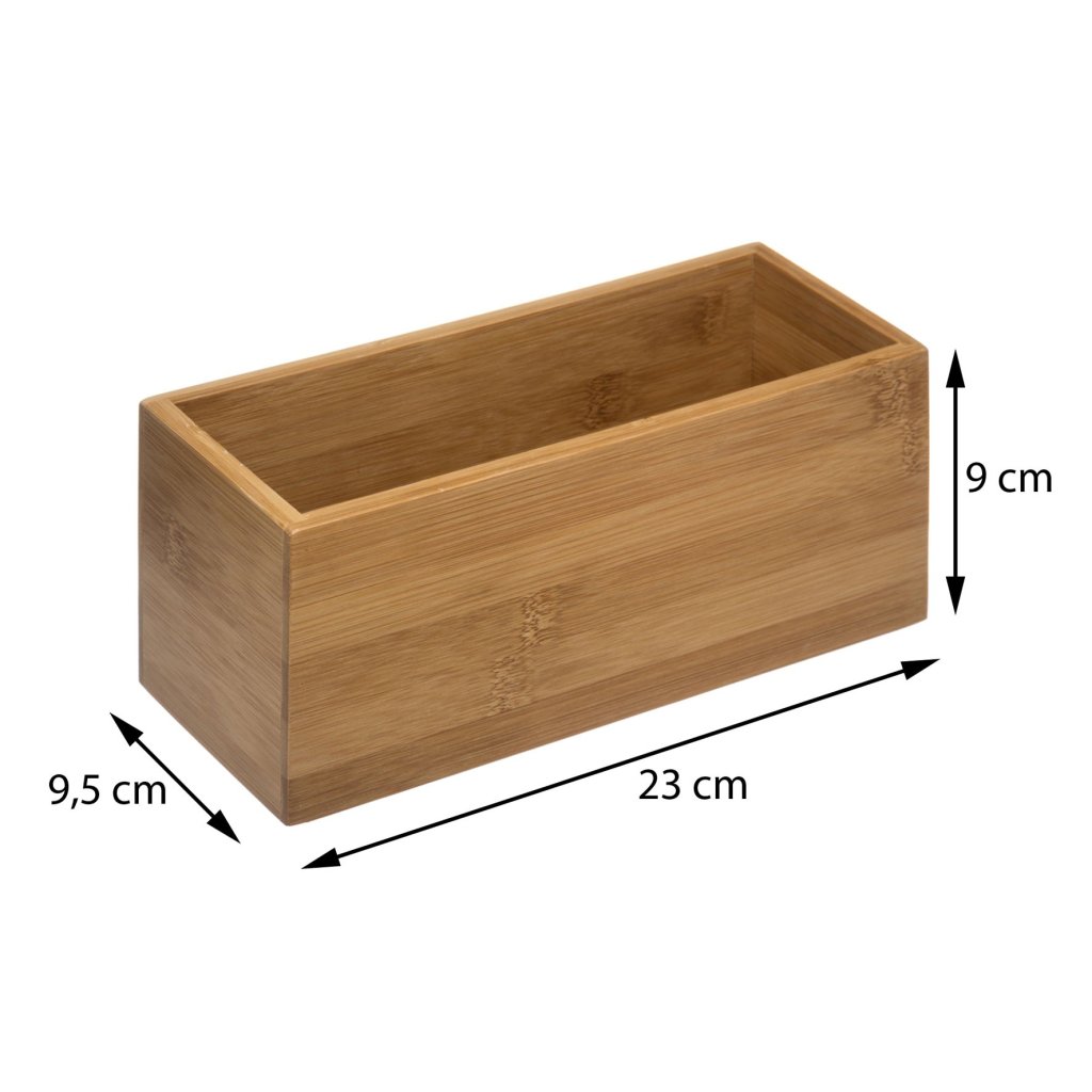 Bambusový organizér vám pomůže uspořádat malé předměty v kuchyni, koupelně a dokonce i v ložnici. Vyrobený z bambusového dřeva působí moderně a elegantně, díky čemuž se hodí téměř do každého stylu interiéru. Organizér je díky své obdélníkové vyšší konstrukci ideální pro pořádání delších předmětů. Díky pevné konstrukci je nádoba odolná vůči vlhkosti a poškození.Doplňkové parametry