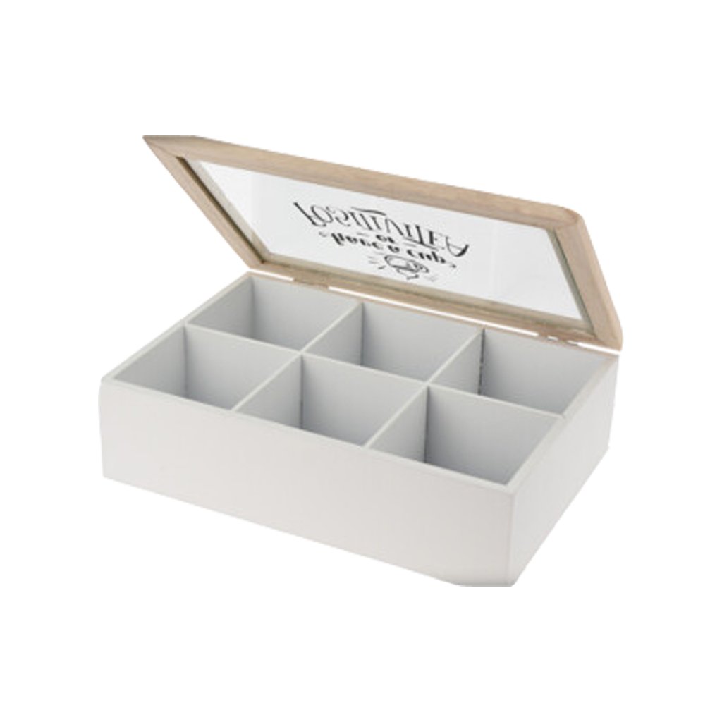 Stylová dřevěná nádoba na čaj je nezbytným artiklem, který nesmí chybět v kuchyni každého milovníka tohoto nápoje. Čajový organizér má šest přihrádek, které vám umožní uložit velké množství čajových sáčků a oddělit různé druhy příchutí. Čajová krabička je uzavřena, což ji ochrání před hmyzem a prachem a navíc si déle zachová aroma. Víko je vybaveno průhledným sklem, které usnadňuje přehled o obsahu nádoby.Doplňkové parametry