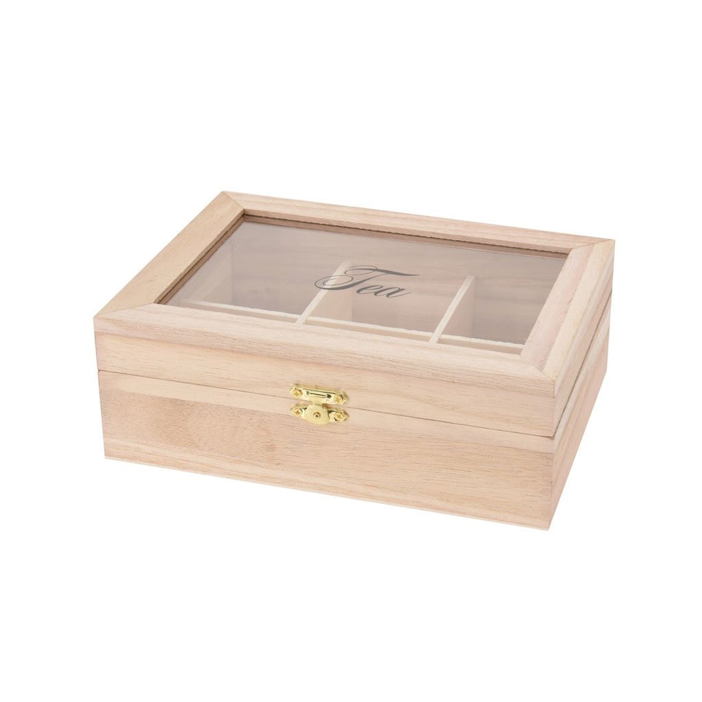 Stylová dřevěná krabička na čaj se šesti přihrádkami na čajové sáčky. Díky tomu si můžete vytřídit své oblíbené chutě. Skleněné víko s ozdobným nápisem a pozlacené zavírání činí z boxu nejen funkční, ale také vkusnou dekoraci kuchyně.Doplňkové parametry