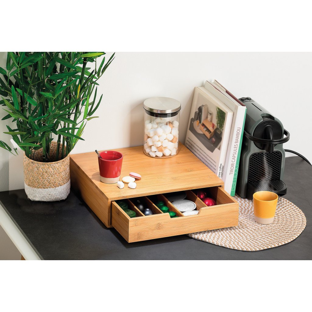 Prezentovaná nádoba představuje jedinečný způsob skladování kávových kapslí, takže od nynějška budete mít svou oblíbenou kávu vždy po ruce. Ergonomický tvar nádoby a pět přihrádek vám umožní uložit velké množství kapslí, což vám ušetří spoustu místa. Minimalistický vzhled boxu a tlumená barevnost dělají z nádoby kromě praktického využití i skvělý dekorativní prvek, kamkoli ji postavíte. Vyrobeno z přírodního bambusového dřeva se vyznačuje vysokou odolností a pevností.Doplňkové parametry