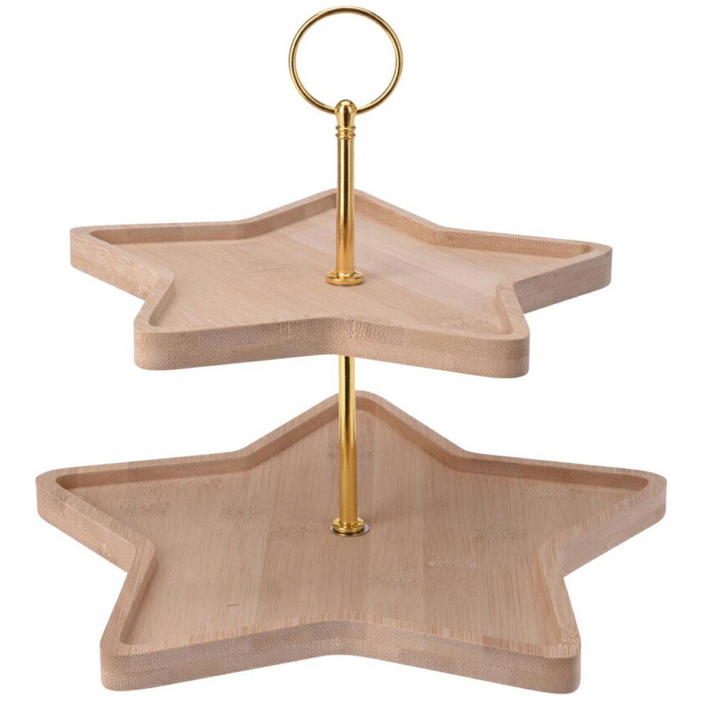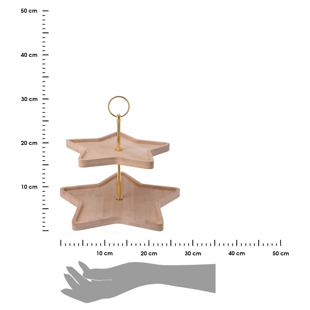 Vneste do svého domu sváteční atmosféru s dvoupatrovým podnosem na občerstvení ve tvaru hvězdy z ekologického bambusu. Tento stylový podnos s jedinečným designem je ideální pro servírování sladkostí, ovoce, koláčků nebo jiných pochoutek během rodinných oslav nebo svátečních setkání. Tvar hvězdy a zlatá rukojeť dodávají eleganci a slavnostní atmosféru. Rukojeť na podnosu umožňuje snadné přenášení.Výška: 25 cm