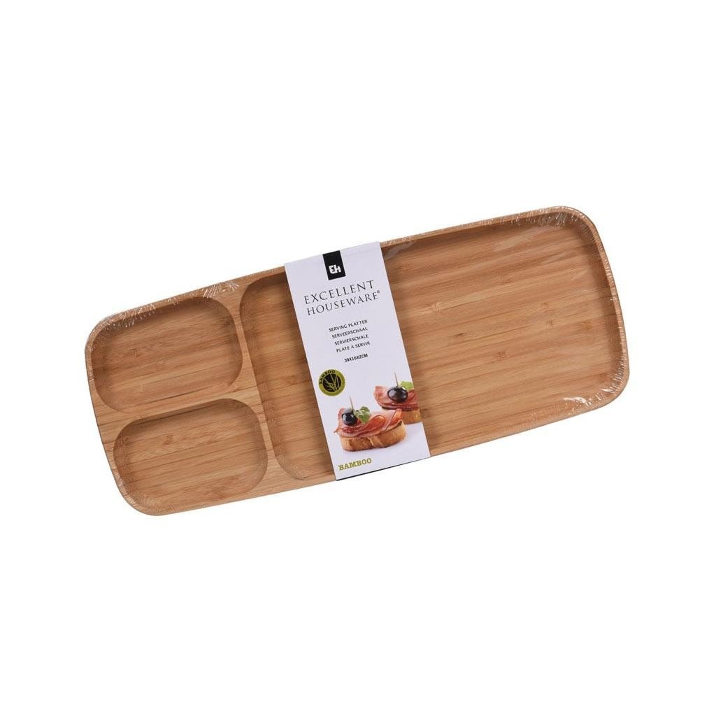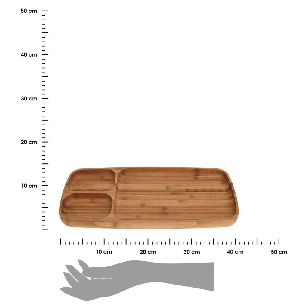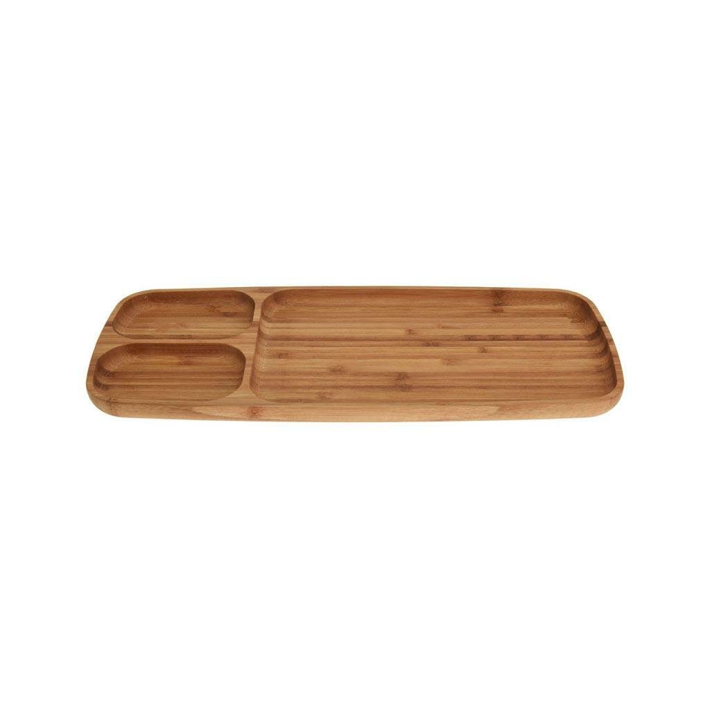 Bambusový podnos pro servírování občerstvení. Zaoblené hrany a vysoká kvalita zpracování dělají tác elegantním a stylovým. Má dvě menší přihrádky na dipy a jednu větší pro podávání větších kusů občerstvení. Módní a praktický prvek stolního nádobí.Výrobek není určen k mytí v myčce nádobí.
