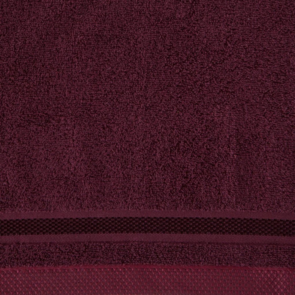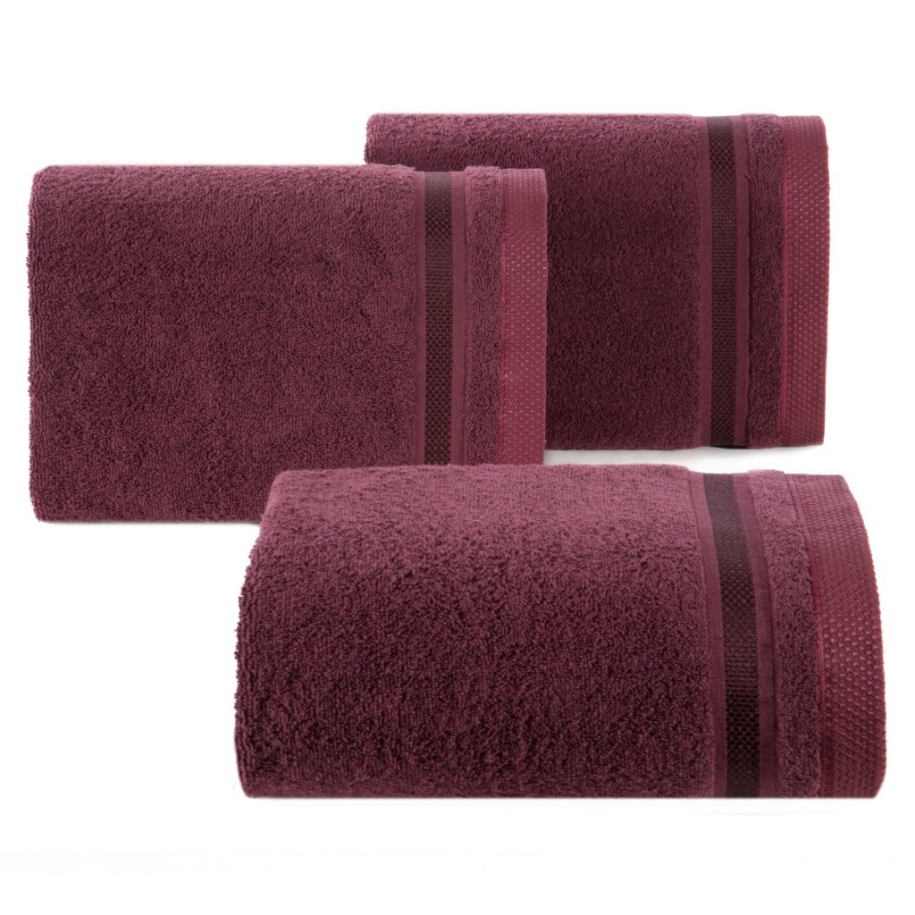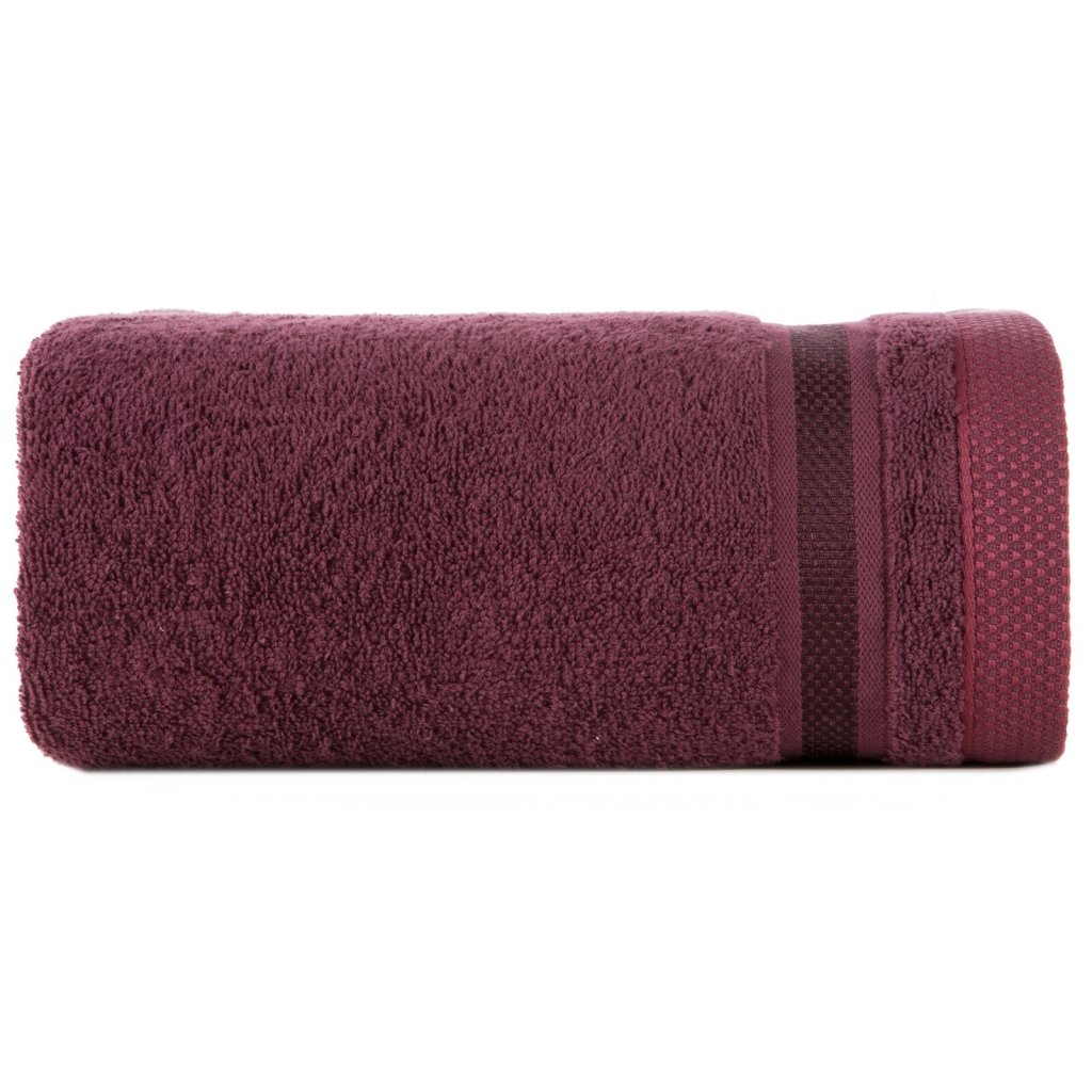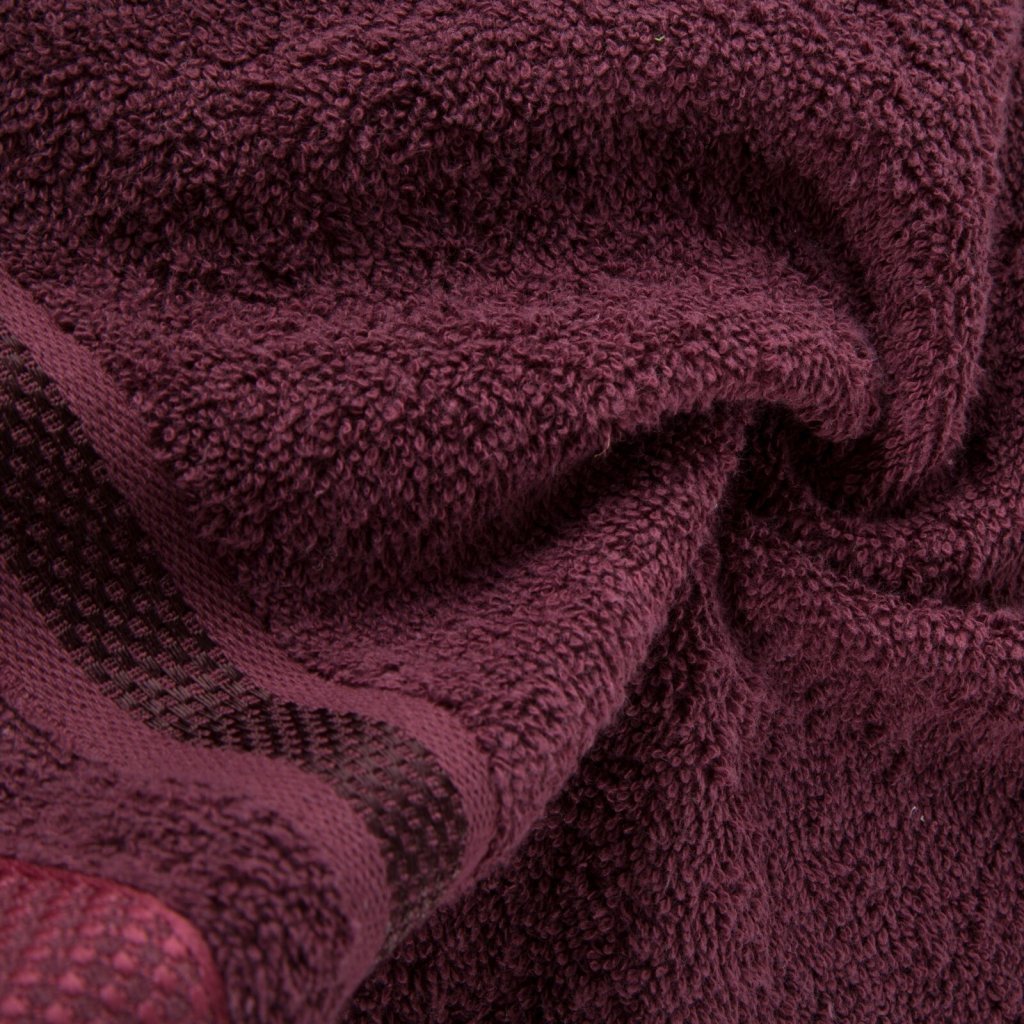 Jednobarevný ručník z měkké a savé bavlněné tkaniny s froté vazbou, zdobený barevným vínovým bastingem. Šířka: 100 cm, délka: 150 cm, barva: vínová, gramáž: 500 GSM, složení: 100% bavlna; ozdobná část: 75% polyester, 25% viskóza.Doplňkové parametry