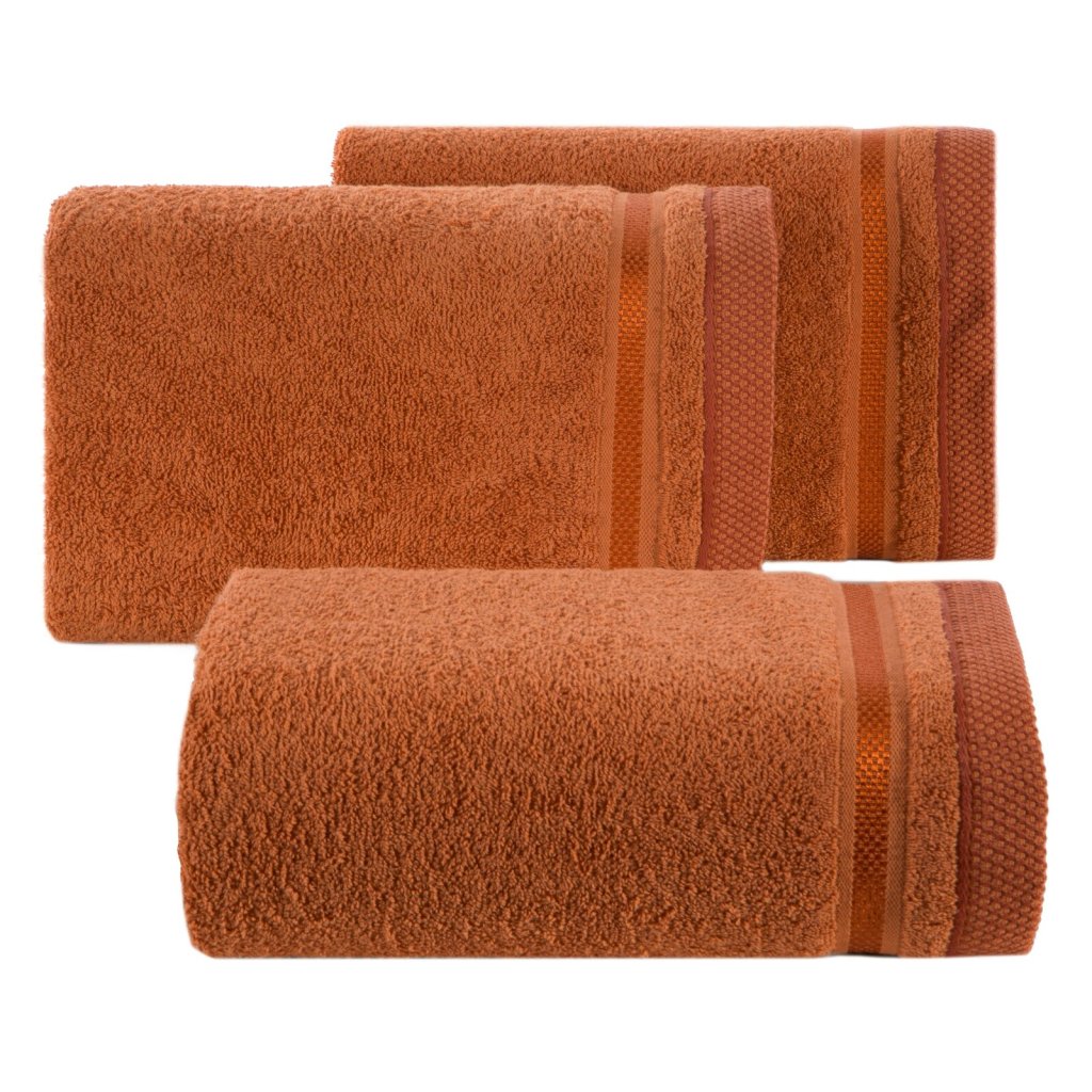 Ručník z měkké a savé bavlněné tkaniny s froté vazbou, zdobený barevným lemem ve stylu bastingu. Šířka: 30 cm, délka: 50 cm, barva: oranžová, gramáž: 500 GSM, složení: 100% bavlna; ozdobná část: 75% polyester, 25% viskóza.Doplňkové parametry