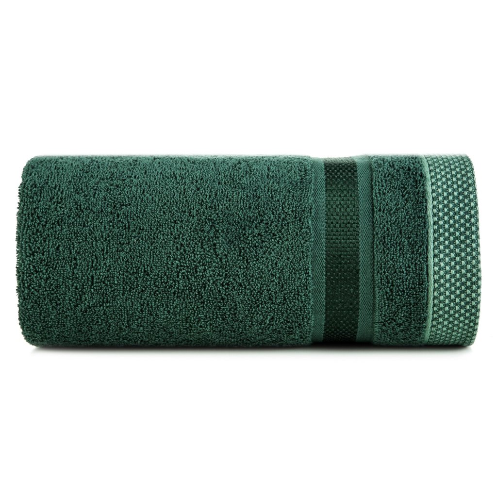 Ručník z měkké a savé bavlněné tkaniny s froté vazbou, zdobený barevným lemem ve stylu bastingu. Šířka: 30 cm, délka: 50 cm, barva: tmavě zelená, gramáž: 500 GSM, složení: 100% bavlna; ozdobná část: 75% polyester, 25% viskóza.Doplňkové parametry