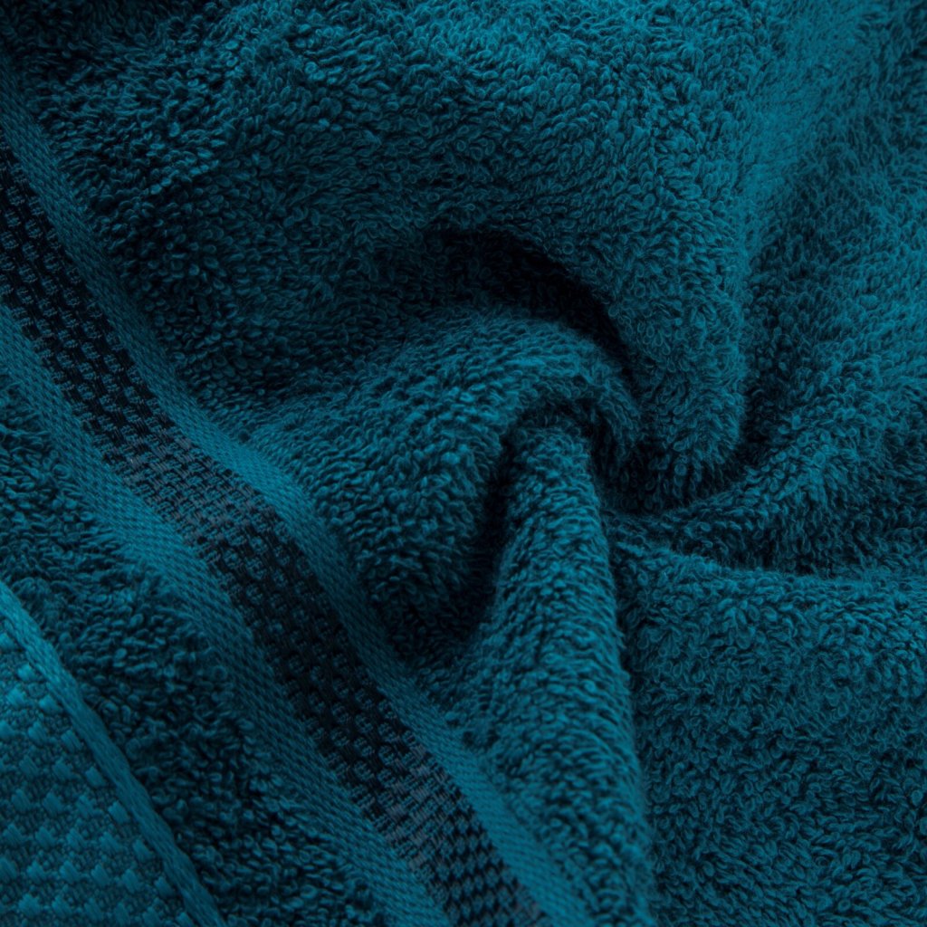 Ručník z měkké a savé bavlněné tkaniny s froté vazbou, zdobený barevným lemem ve stylu bastingu. Šířka: 40 cm, délka: 60 cm, barva: tyrkysová, gramáž: 500 GSM, složení: 100% bavlna; ozdobná část: 75% polyester, 25% viskóza.Doplňkové parametry