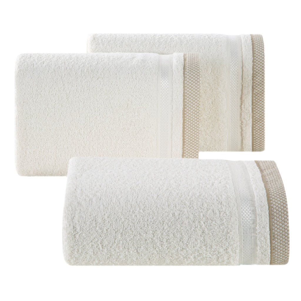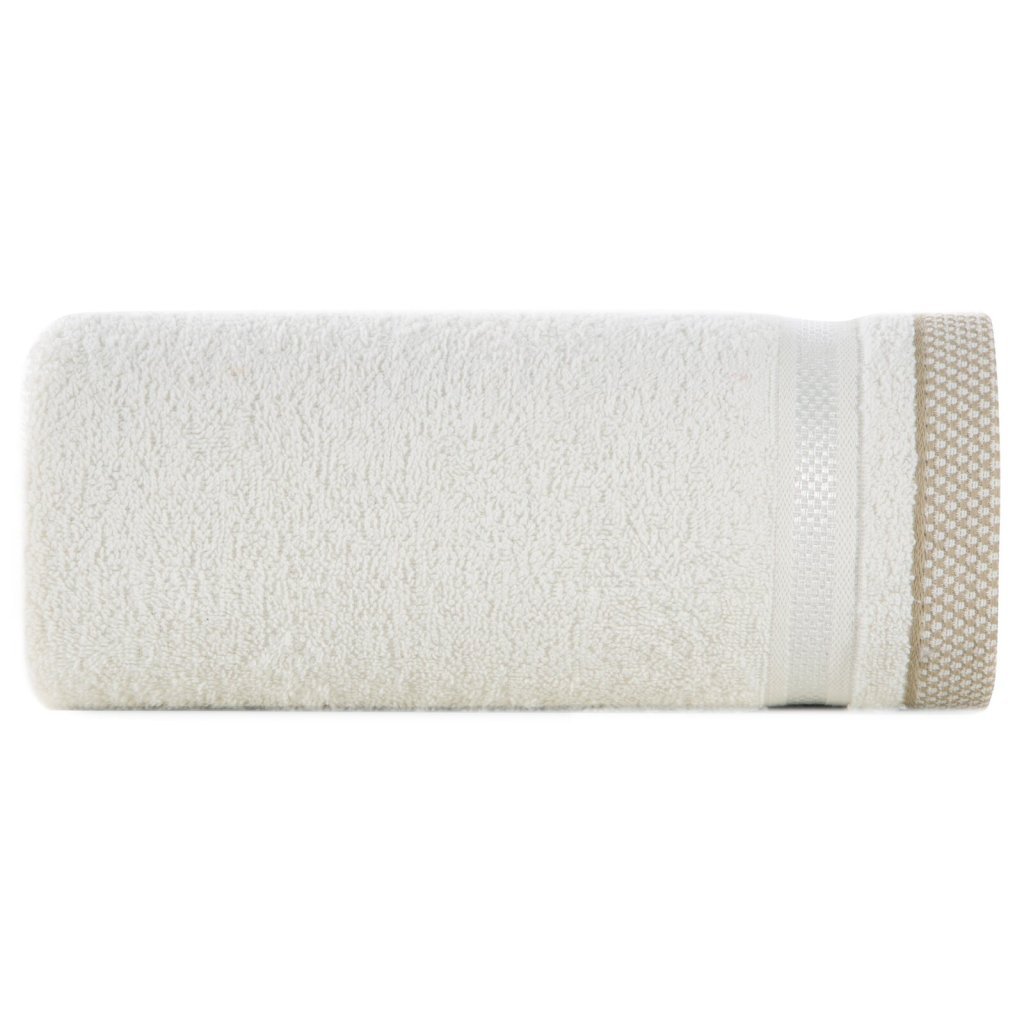 Ručník z měkké a savé bavlněné tkaniny s froté vazbou, zdobený barevným lemem ve stylu bastingu. Šířka: 50 cm, délka: 90 cm, barva: krémová, gramáž: 500 GSM, složení: 100% bavlna; ozdobná část: 75% polyester, 25% viskóza.Doplňkové parametry
