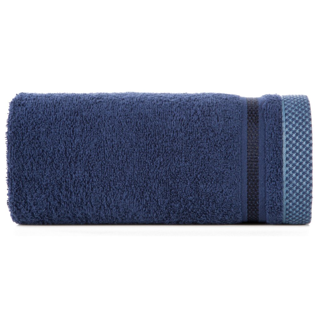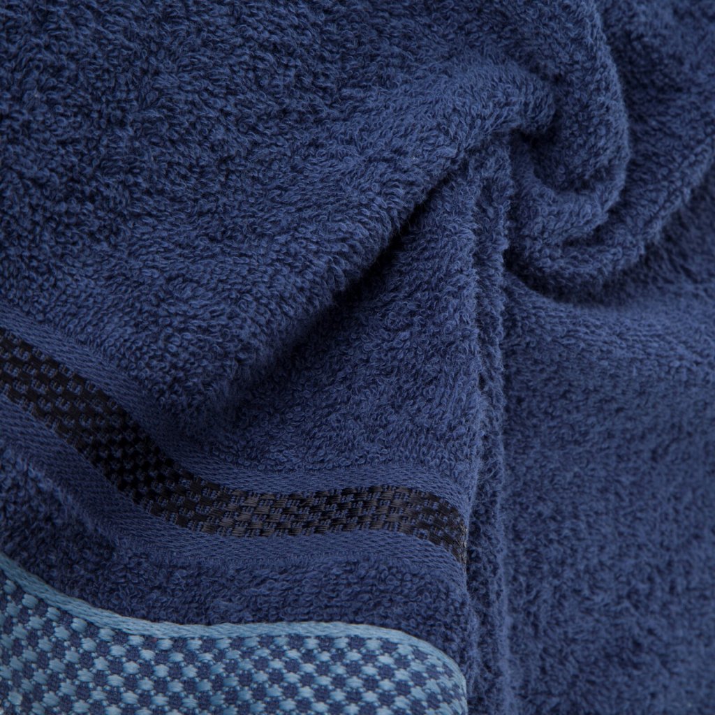 Jednobarevný ručník z měkké a savé bavlněné tkaniny s froté vazbou, zdobený barevným vínovým bastingem. Šířka: 50 cm, délka: 90 cm, barva: tmavě modrá, gramáž: 500 GSM, složení: 100% bavlna; ozdobná část: 75% polyester, 25% viskóza.Doplňkové parametry