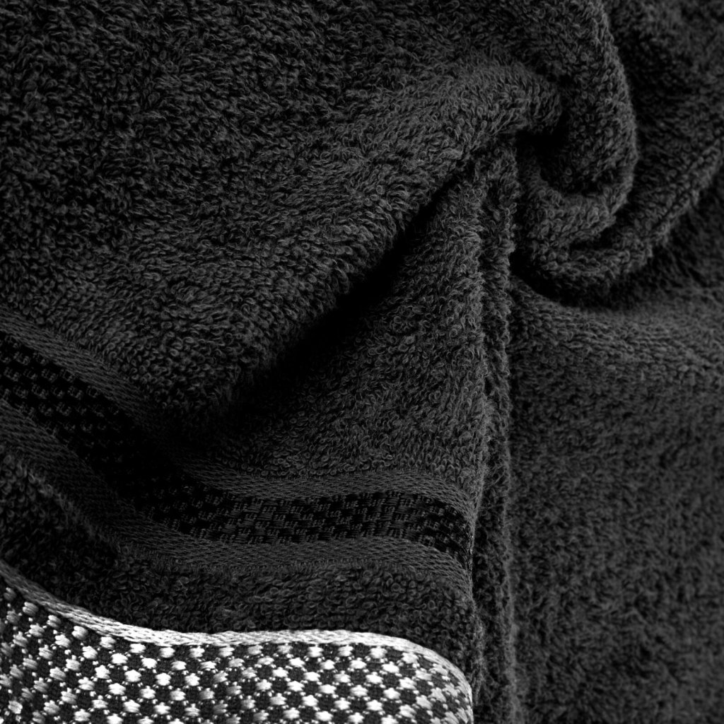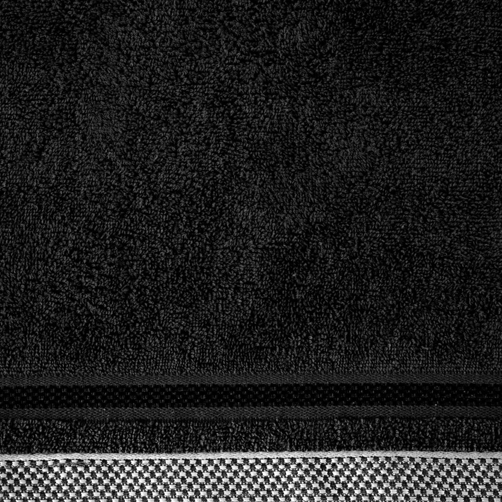 Ručník z měkké a savé bavlněné tkaniny s froté vazbou, zdobený barevným lemem ve stylu bastingu. Šířka: 70 cm, délka: 140 cm, barva: černá, gramáž: 500 GSM, složení: 100% bavlna; ozdobná část: 75% polyester, 25% viskóza.Doplňkové parametry