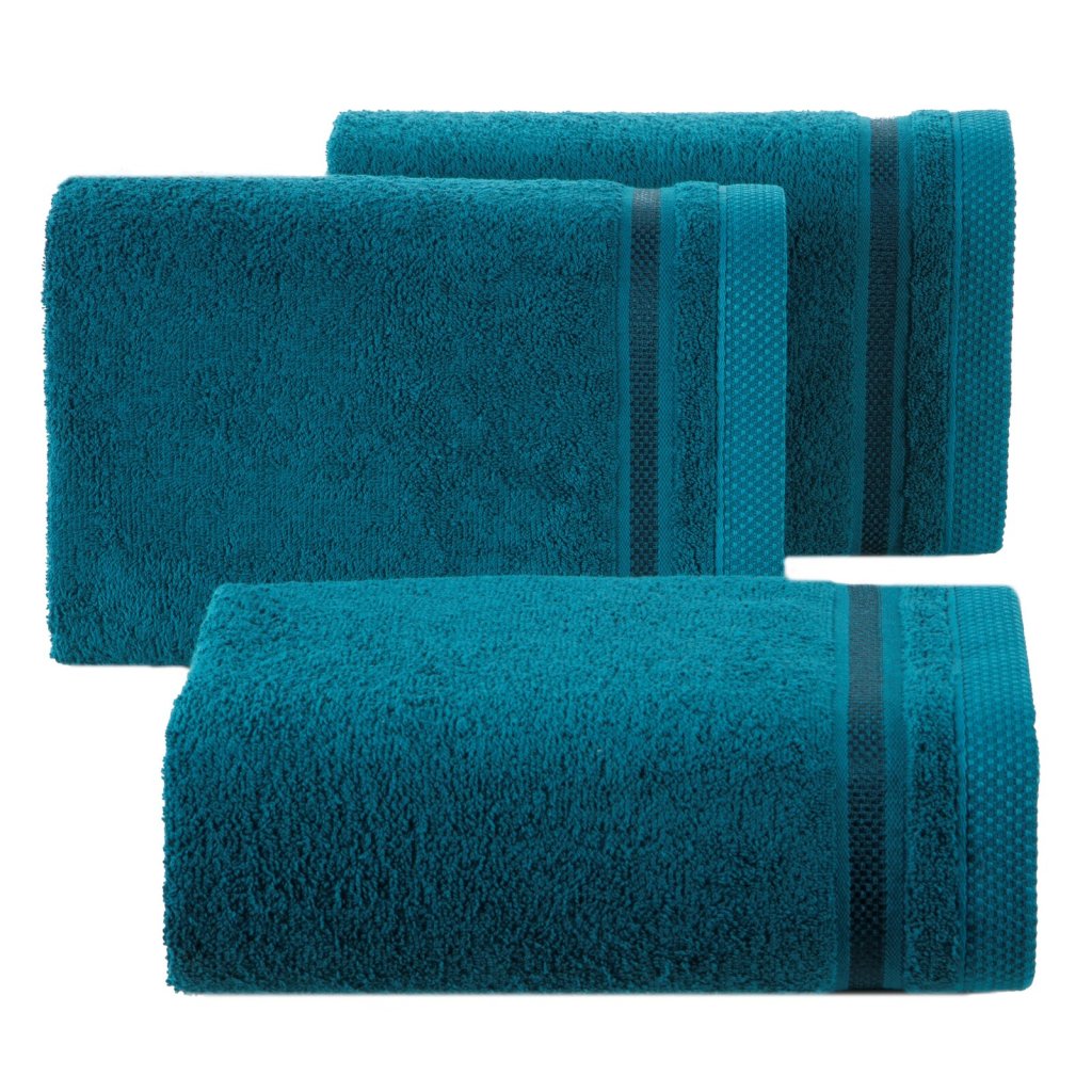 Ručník z měkké a savé bavlněné tkaniny s froté vazbou, zdobený barevným lemem ve stylu bastingu. Šířka: 70 cm, délka: 140 cm, barva: tyrkysová, gramáž: 500 GSM, složení: 100% bavlna; ozdobná část: 75% polyester, 25% viskóza.Doplňkové parametry