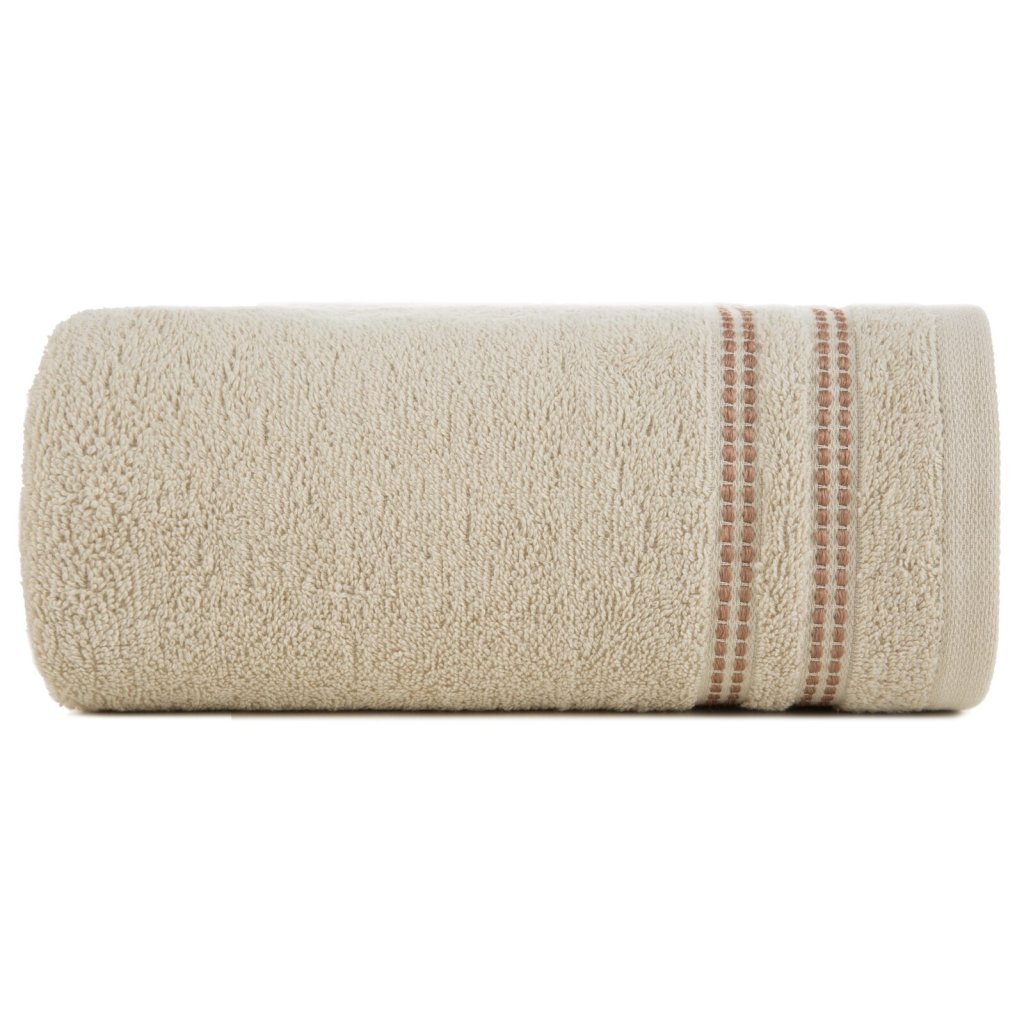 Ručník je vyroben ze savé bavlněné tkaniny s froté vazbou. Minimalistický sametový lem s přídavkem lesklých kovových vláken. Šířka: 30 cm, délka: 50 cm, barva: béžová, gramáž: 500 GSM, složení: 100% bavlna; ozdobná část: 96% bavlna, 4% polyester.Doplňkové parametry
