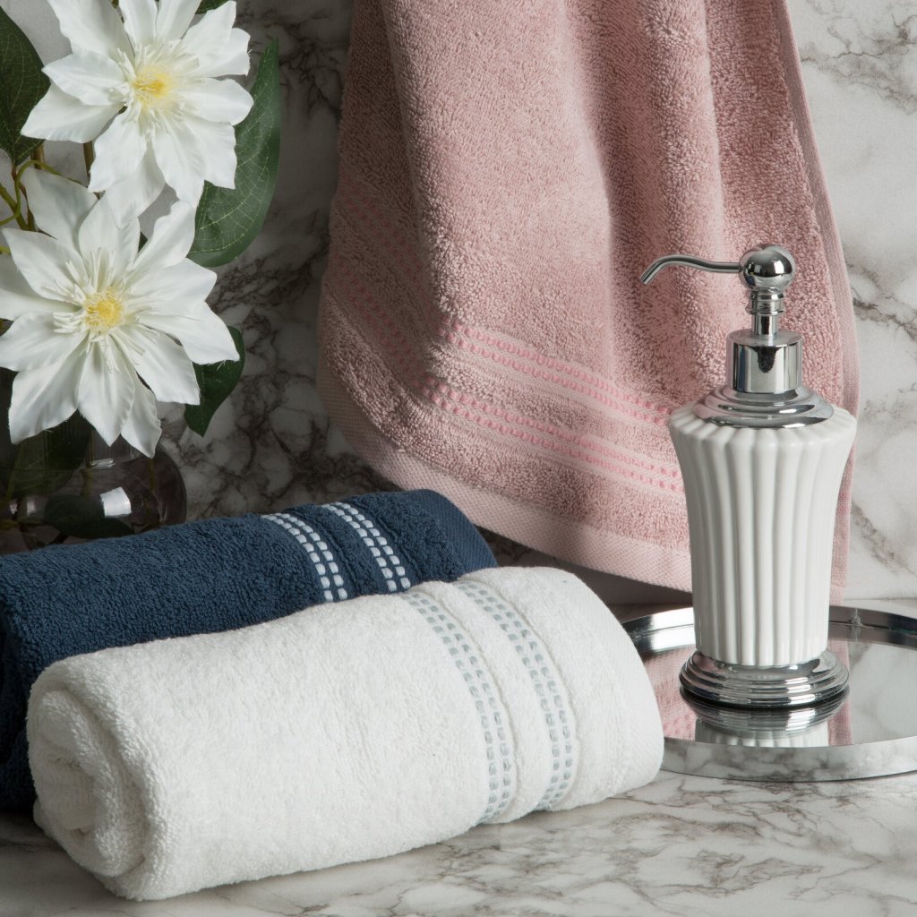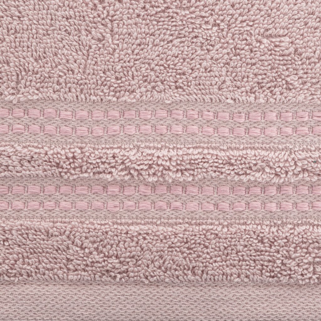 Ručník je vyroben ze savé bavlněné tkaniny s froté vazbou. Minimalistický sametový lem s přídavkem lesklých kovových vláken. Šířka: 30 cm, délka: 50 cm, barva: pudrová, gramáž: 500 GSM, složení: 100% bavlna; ozdobná část: 96% bavlna, 4% polyester.Doplňkové parametry