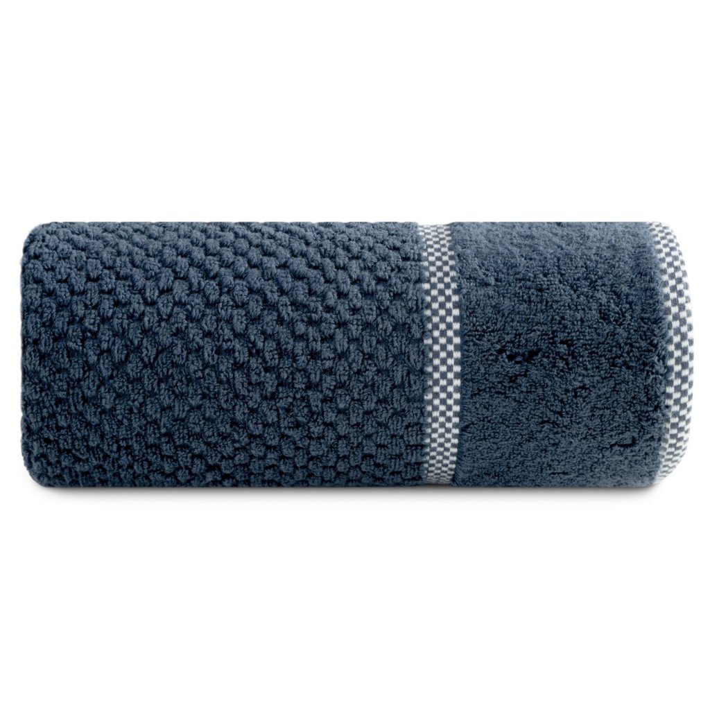 Ručník z měkké froté bavlny s jemnou károvanou ražbou a lemem se stejným, výraznějším vzorem. Šířka: 70 cm, délka: 140 cm, barva: tmavě modrá, hmotnost: 540 GSM, složení: 100 % bavlna; ozdobná část: 69 % bavlna, 31 % polyester.Doplňkové parametry