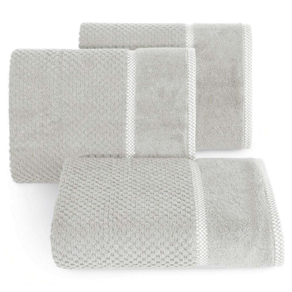 Vysoce savý ručník z měkkého bavlněného froté s jemnou károvanou ražbou a lemováním ve stejném, výraznějším vzoru. Šířka: 70 cm, délka: 140 cm, barva: stříbrná, gramáž: 540 GSM, složení: 100% bavlna.Doplňkové parametry