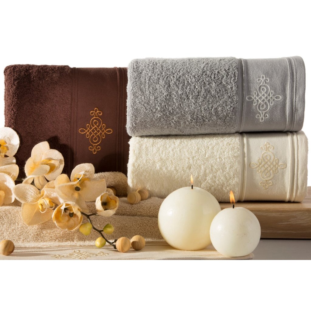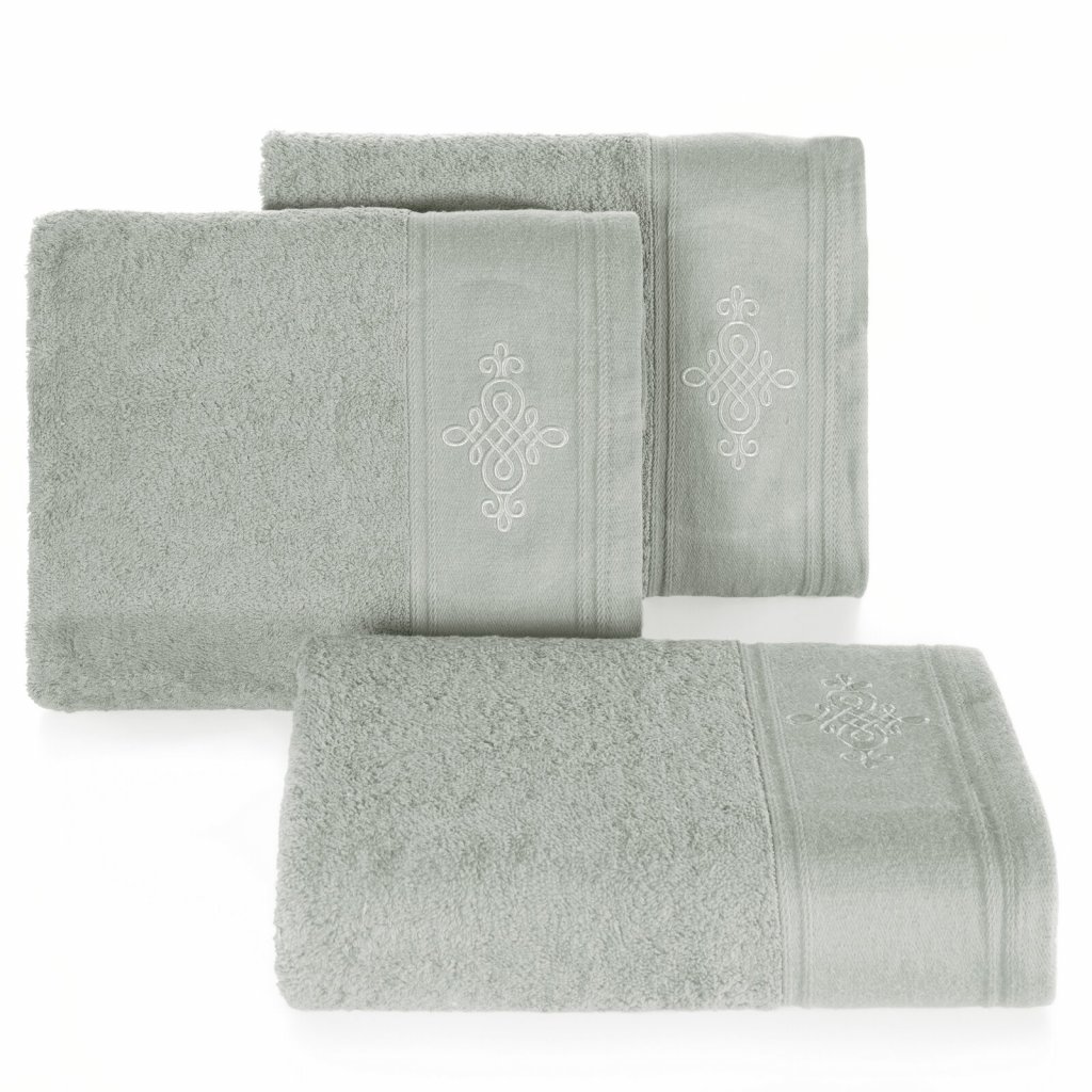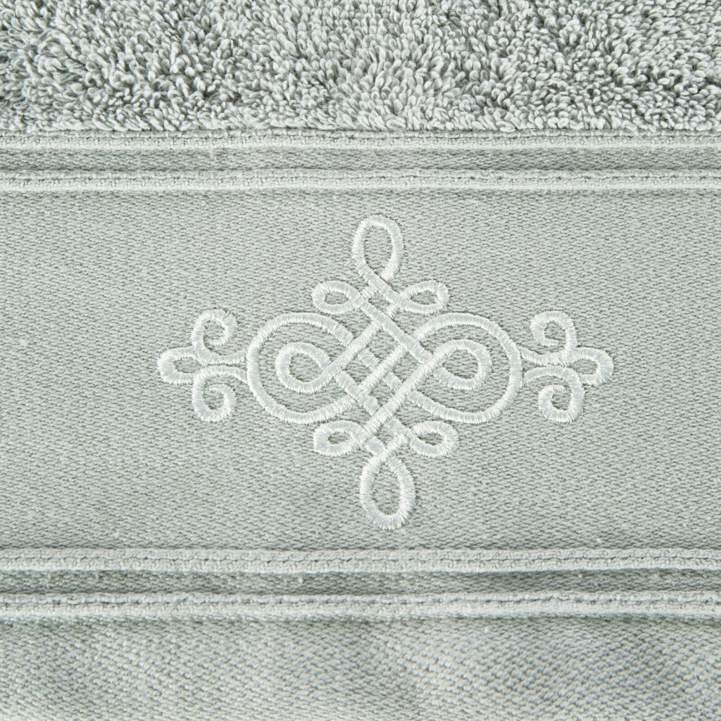 Bavlněný ručník z měkkého, savého froté. Široký okraj je zdobený jemným ornamentem. Šířka 70 cm, délka 140 cm, barva: stříbrná, gramáž: 600 GSM, složení: 100% bavlna.Doplňkové parametry