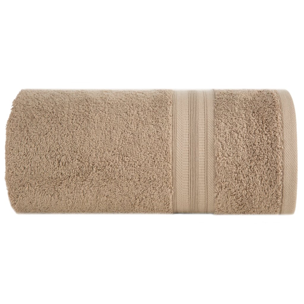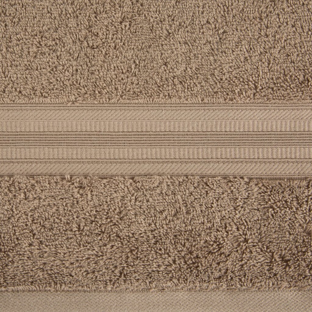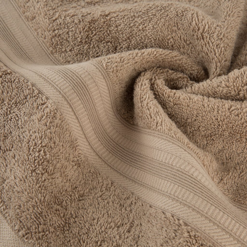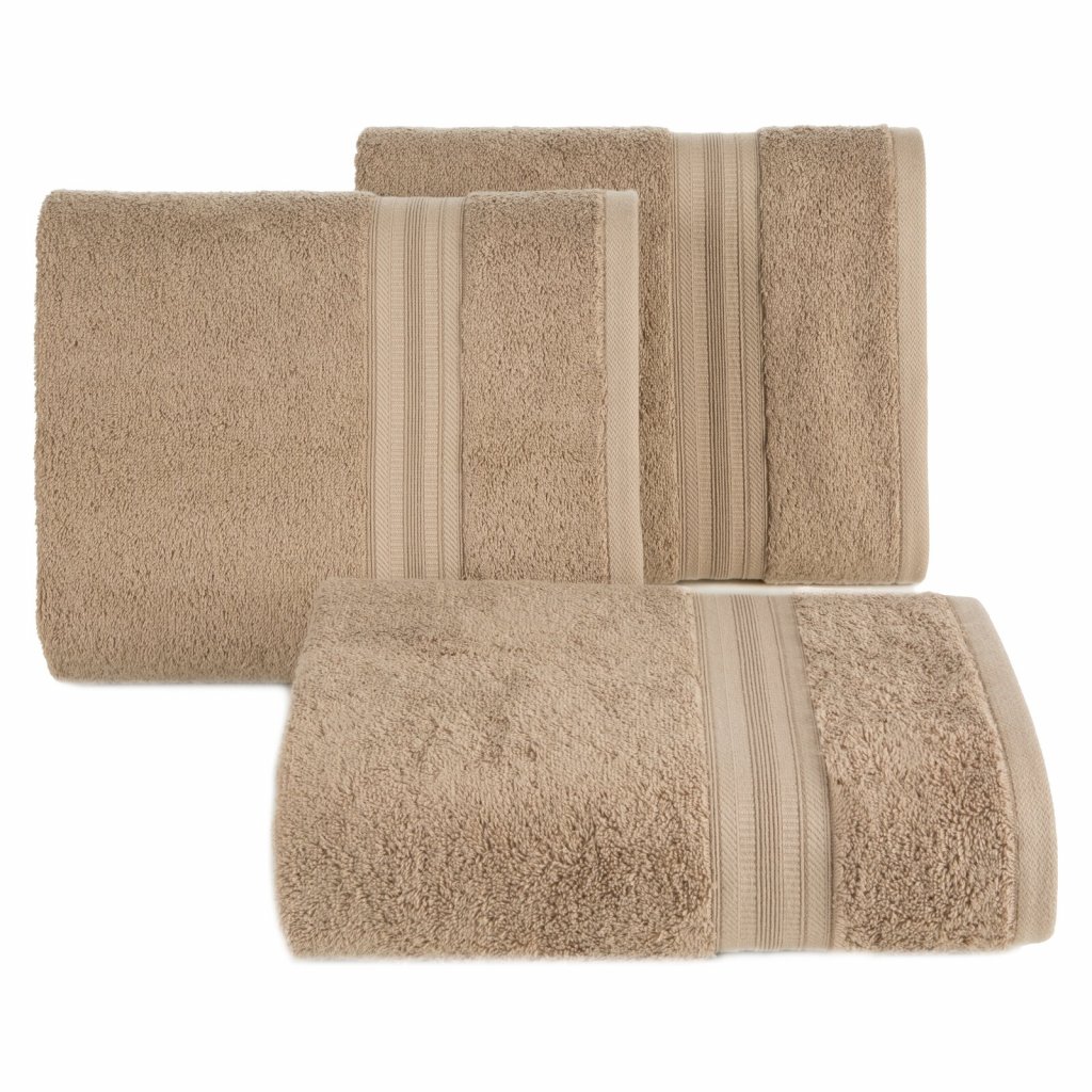 Ručník z měkké a savé bavlněné tkaniny s froté vazbou, zdobený barevným lemem ve stylu bastingu. Šířka: 30 cm, délka: 50 cm, barva: béžová, hmotnost: 550 GSM, složení: 100% bavlna.Doplňkové parametry