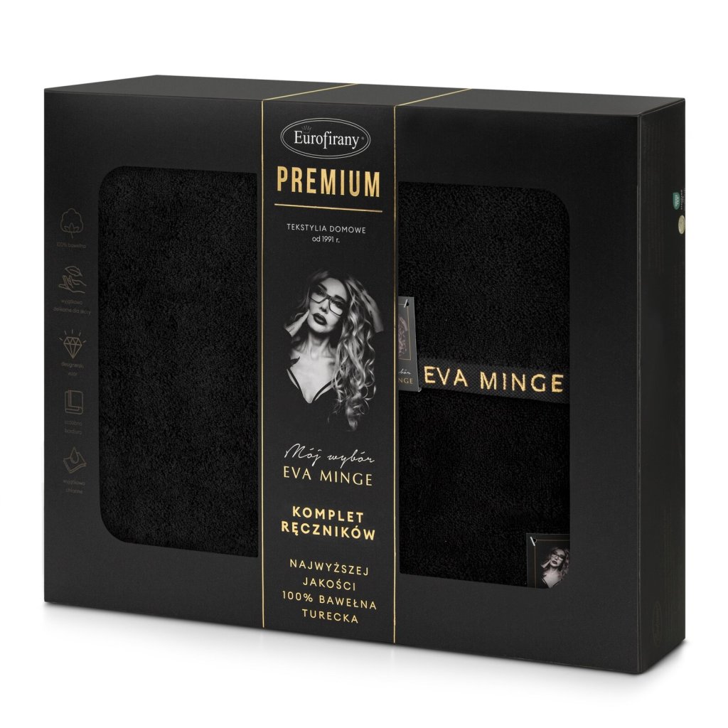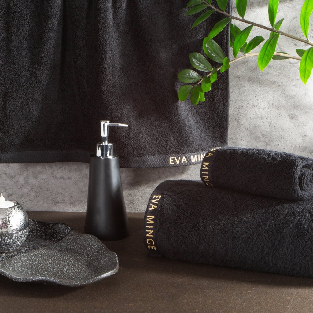 Nejkvalitnější látky, jedinečné a výrazné vzory a módní barvy v souladu s nejnovějšími světovými trendy jsou charakteristickými znaky nejnovější kolekce podepsané Evou Minge. Barevně sladěné ručníky s úzkým vyšívaným okrajem s logem Eva Minge podtrhnou jedinečný styl koupelny. Mimořádně měkká a nadýchaná froté bavlna s vysokou gramáží zajišťuje šetrné sušení. Sada tří ručníků z kolekce EVA MINGE zabalená v elegantní kartonové krabici je ideálním nápadem na originální a praktický dárek. Sada 3 ks ručníků o rozměrech: 70x140 cm - 1 ks, 50x90 cm - 1 ks, 30x50 cm - 1 ks, barva: černá, gramáž: 550 GSM, složení: 100% bavlna.Doplňkové parametry