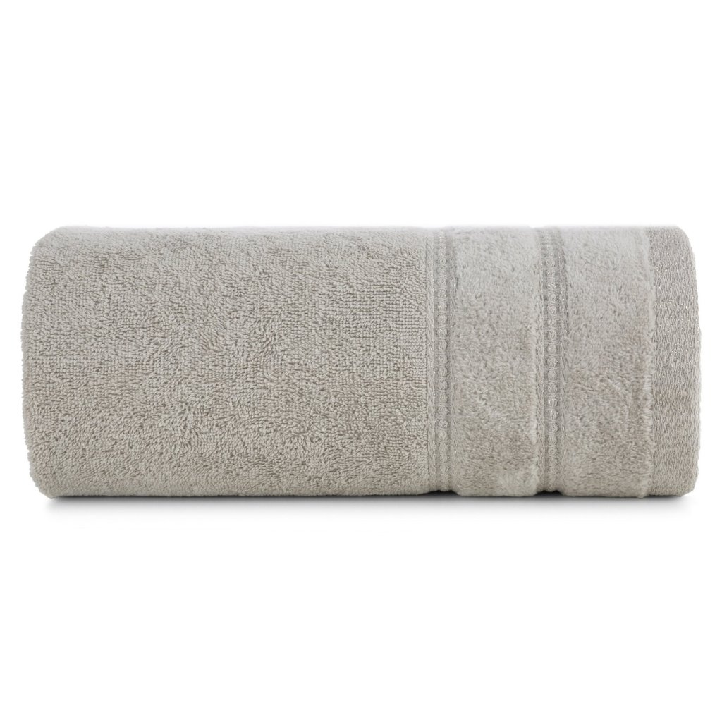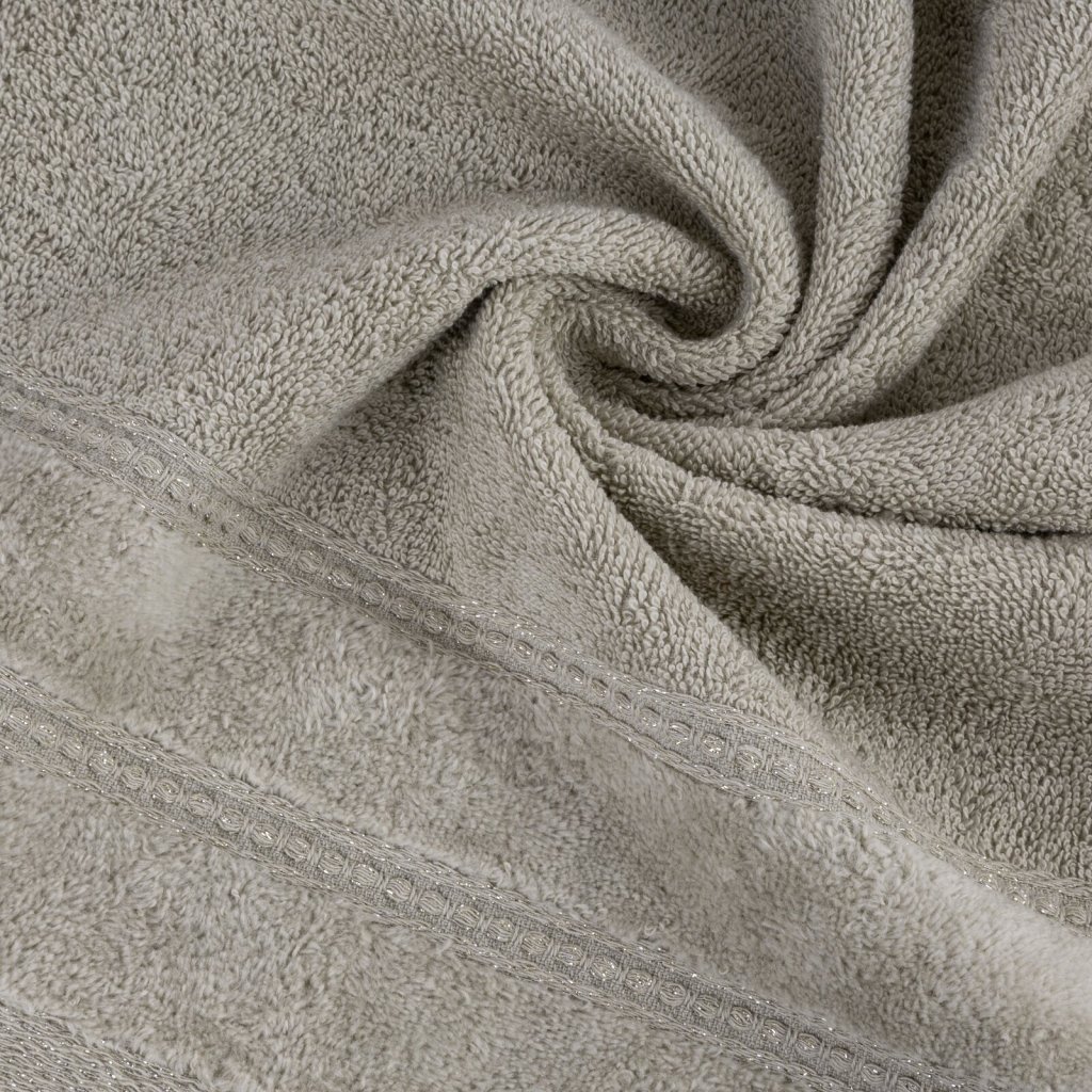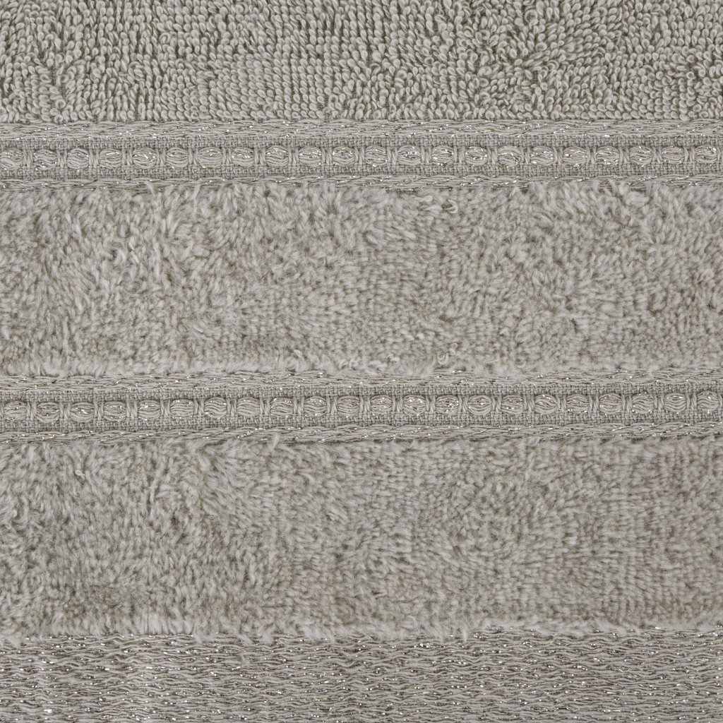 Ručník je vyroben ze savé bavlněné tkaniny s froté vazbou. Minimalistický sametový lem s přídavkem lesklých kovových vláken. Šířka: 30 cm, délka: 50 cm, gramáž: 500 GSM, složení: 100 % bavlna; 99,2 % bavlna, 0,8 % metalické vlákno.Doplňkové parametry