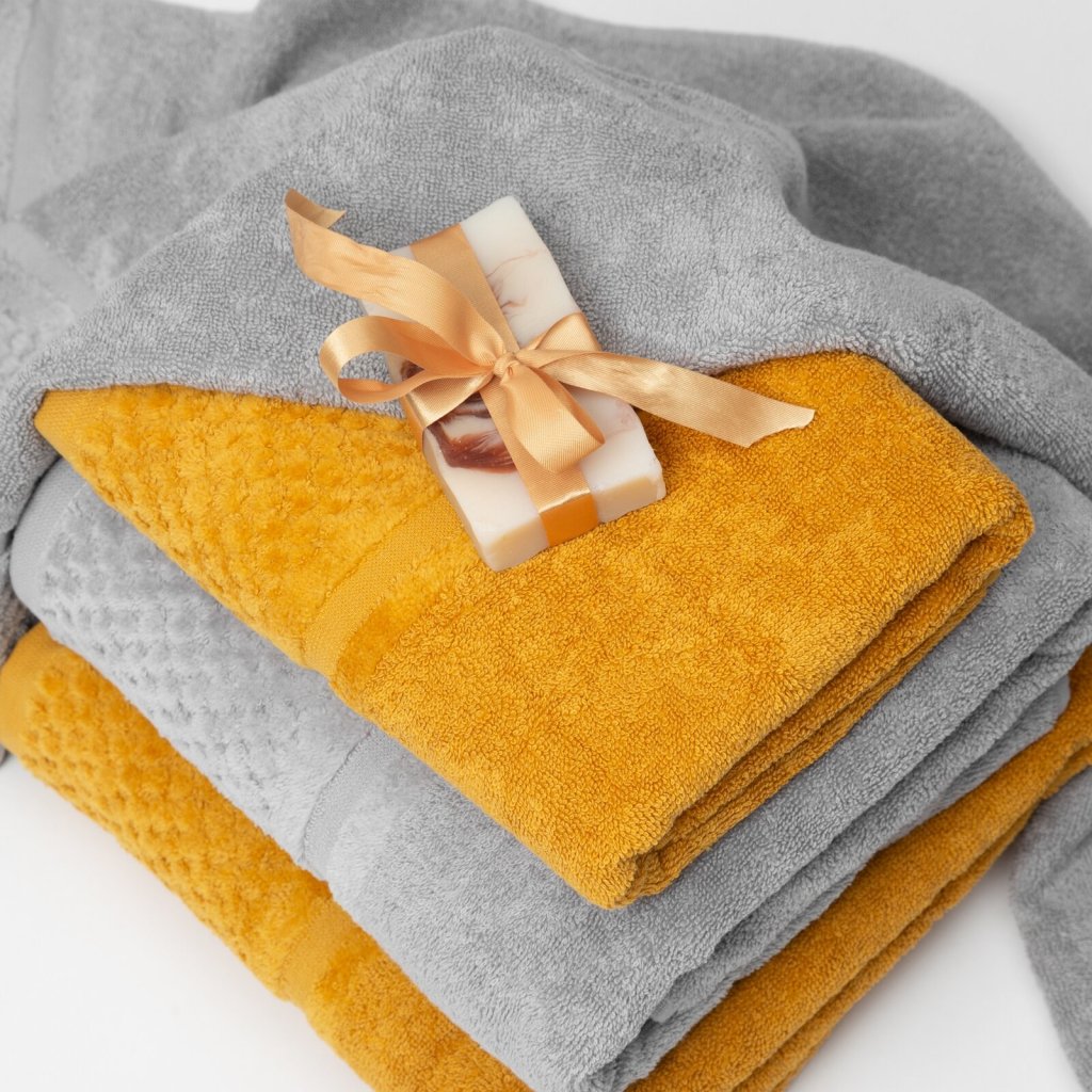 Ručník je vyroben ze savého bavlněného froté. Minimalistický velur je lemován lesklou nití. Šířka: 30 cm, délka: 50 cm, barva: stříbrná, hmotnost: 550 GSM, složení: 100% bavlna.Doplňkové parametry