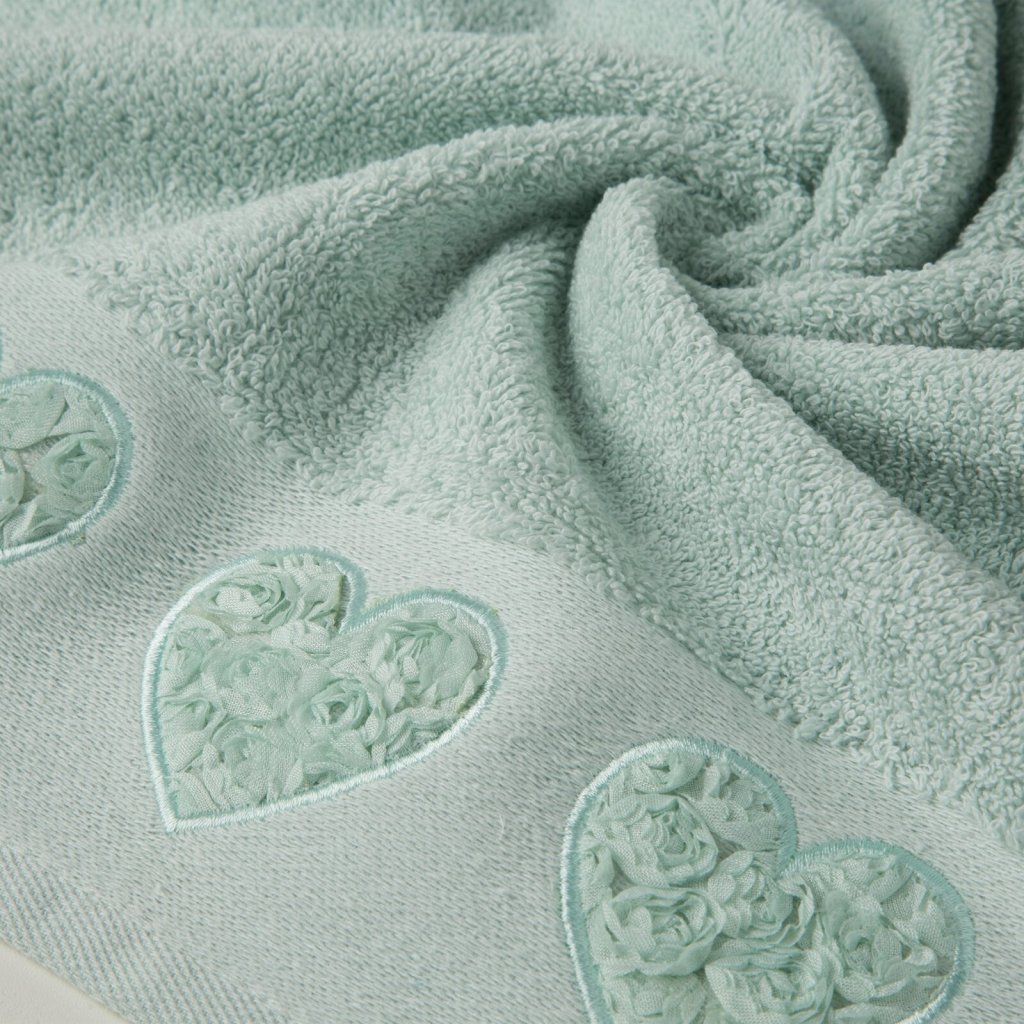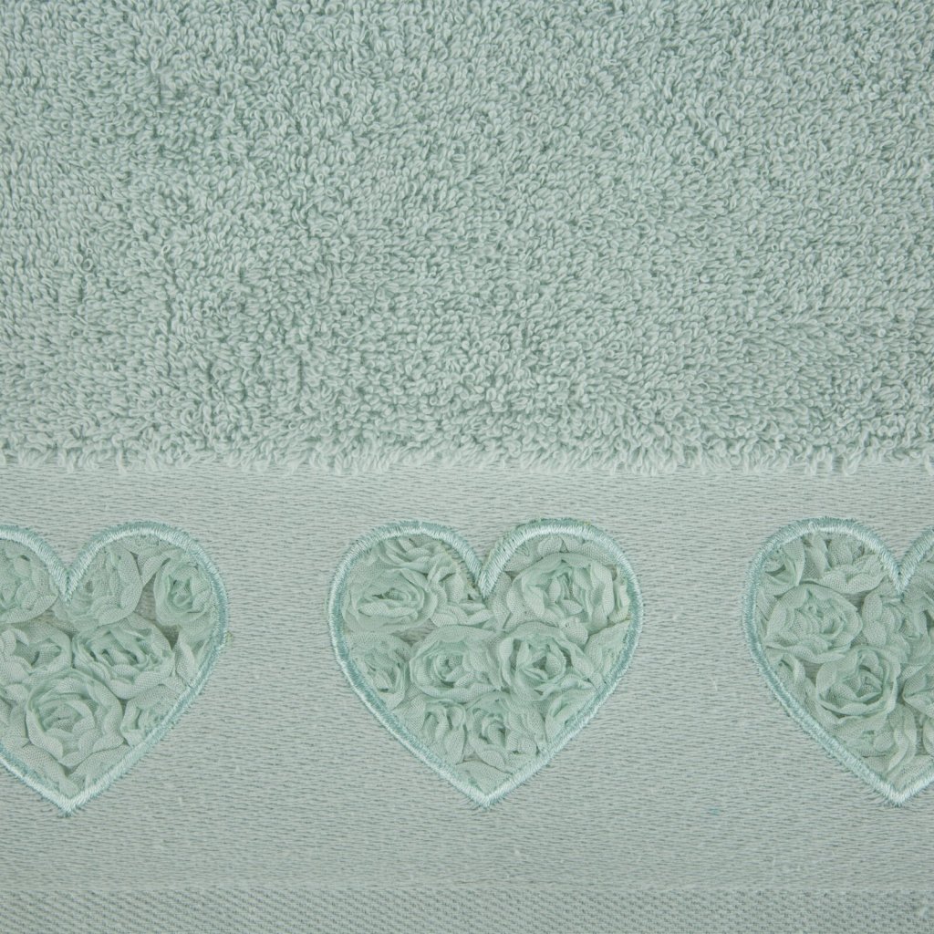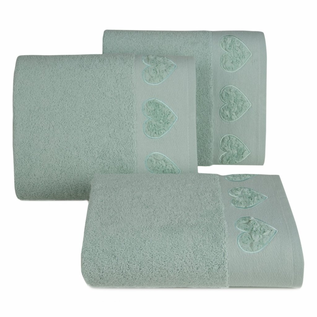 Krásné ručníky z měkké a savé froté bavlny, na okraji zdobené aplikací v podobě srdíček vyplněných rozetami. Ideální jako dárek, šířka: 50 cm, délka: 90 cm, barva: mátová, gramáž: 500 GSM, složení: 100% bavlna.Doplňkové parametry