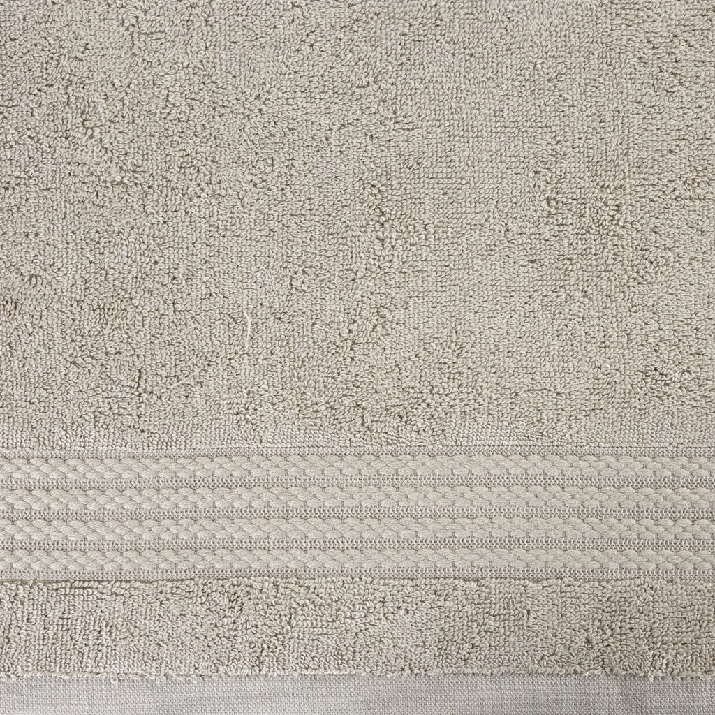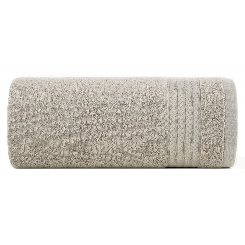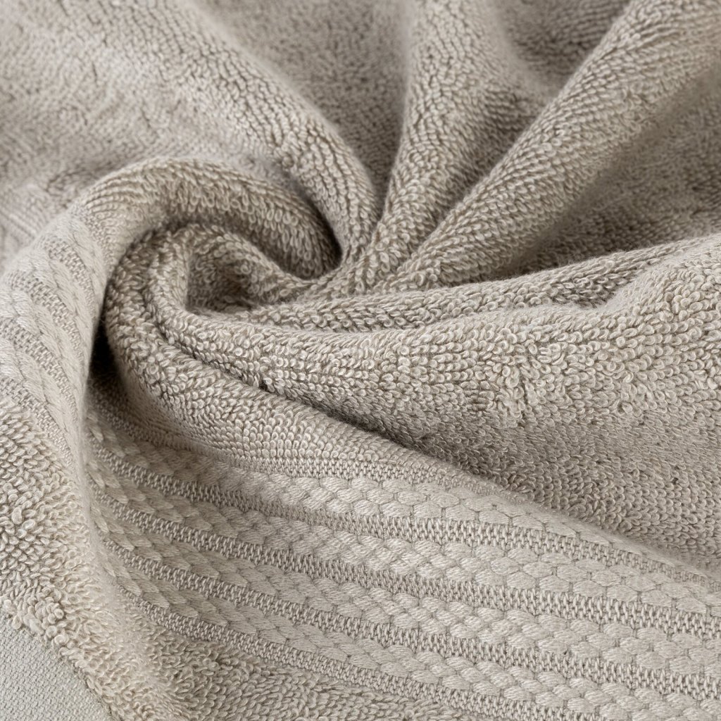 Ručník z měkké a savé bavlněné tkaniny s froté vazbou, zdobený barevným lemem ve stylu bastingu. Šířka: 50 cm, délka: 90 cm, barva: béžová, hmotnost: 550 GSM, složení: 70 % bambus, 30 % bavlna.Doplňkové parametry