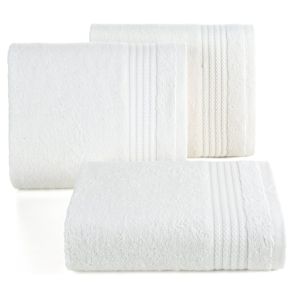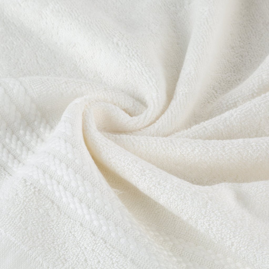 Ručník z měkké a savé bavlněné tkaniny s froté vazbou, zdobený barevným lemem ve stylu bastingu. Šířka: 50 cm, délka: 90 cm, barva: krémová, hmotnost: 550 GSM, složení: 70 % bambus, 30 % bavlna.Doplňkové parametry