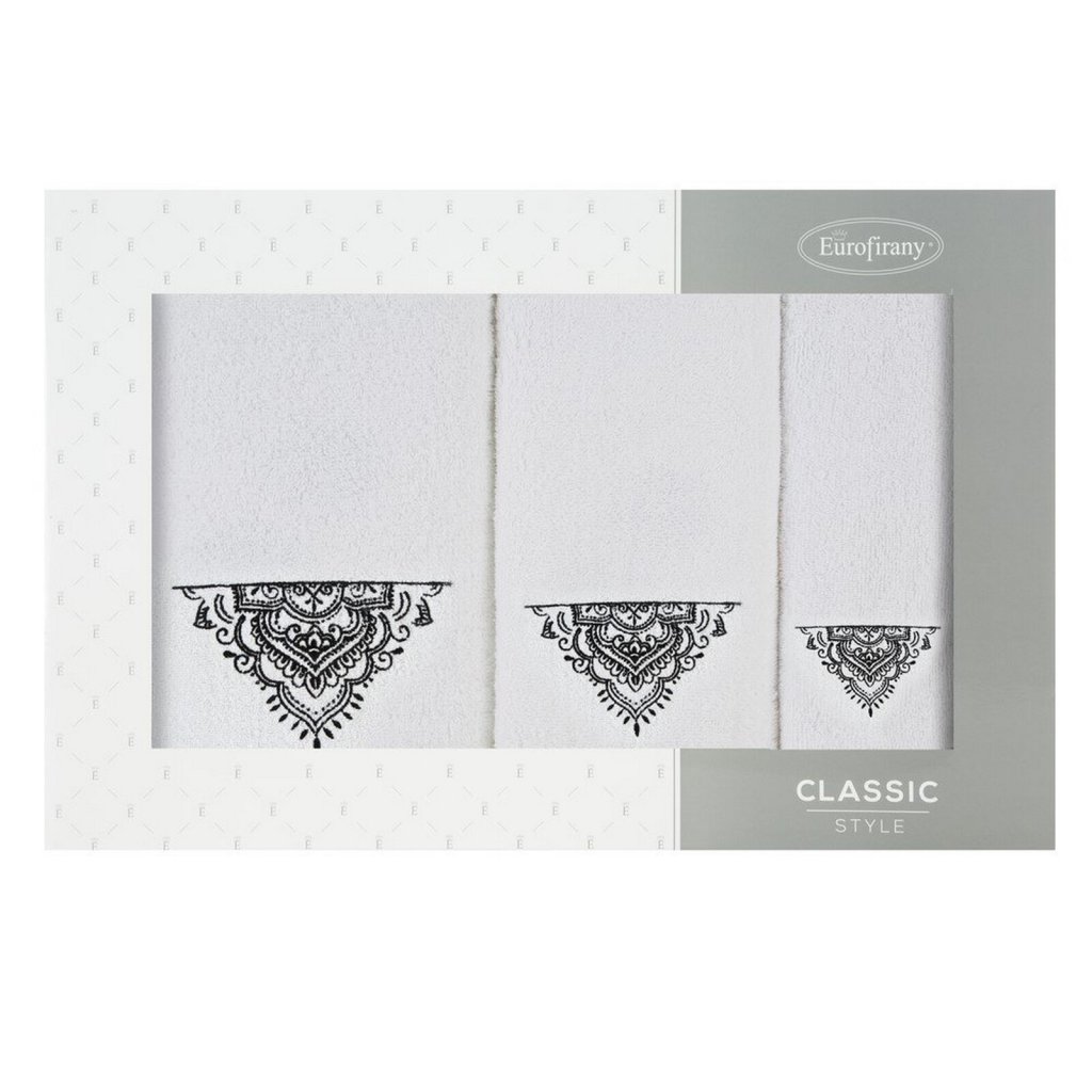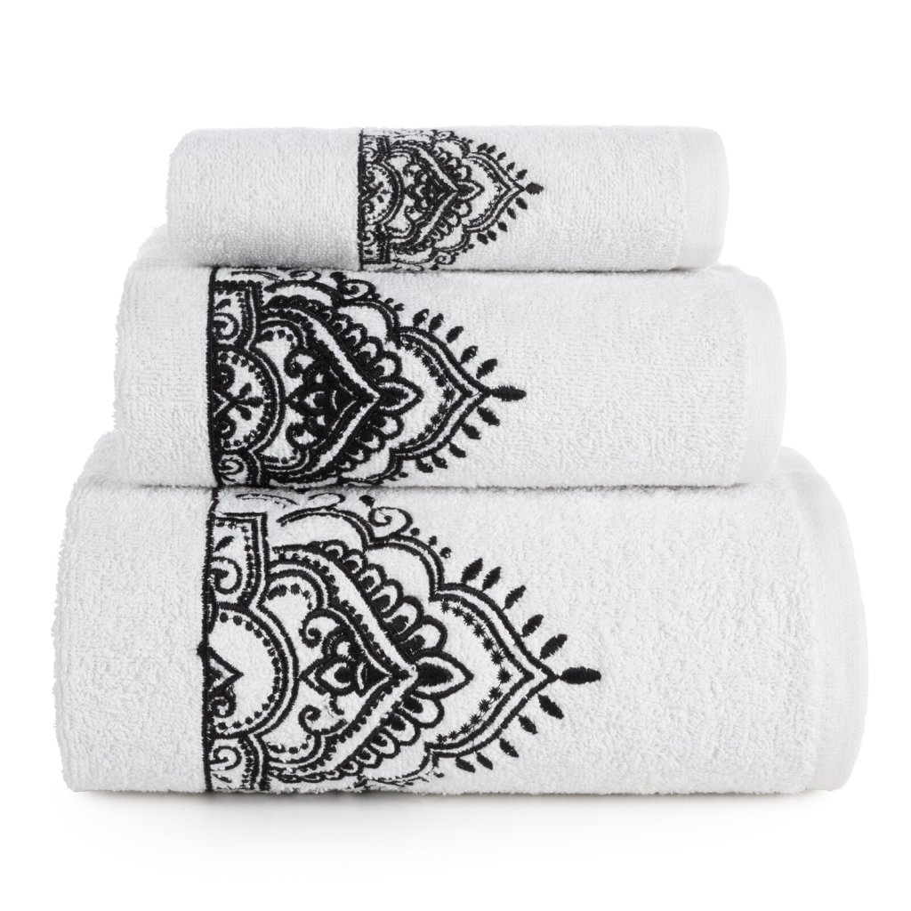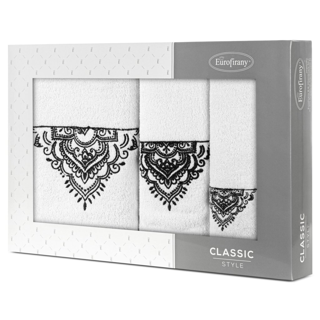 Elegantní sada ručníků LAURA s jemnou výšivkou je ideální volbou. Je vyrobena ze 100% bavlněného froté s certifikací OEKO-TEX® Standard 100. Ručníky vynikají měkkostí a vysokou savostí. Jemná výšivka a estetické balení v kartonové krabici činí z této sady originální dárek. Sada obsahuje 3 ks ručníků o rozměrech: 70x140 cm - 1 ks, 50x90 cm - 1 ks, 30x50 cm - 1 ks , barva: bílá, gramáž: 400 GSM, složení: 100% bavlna.Doplňkové parametry