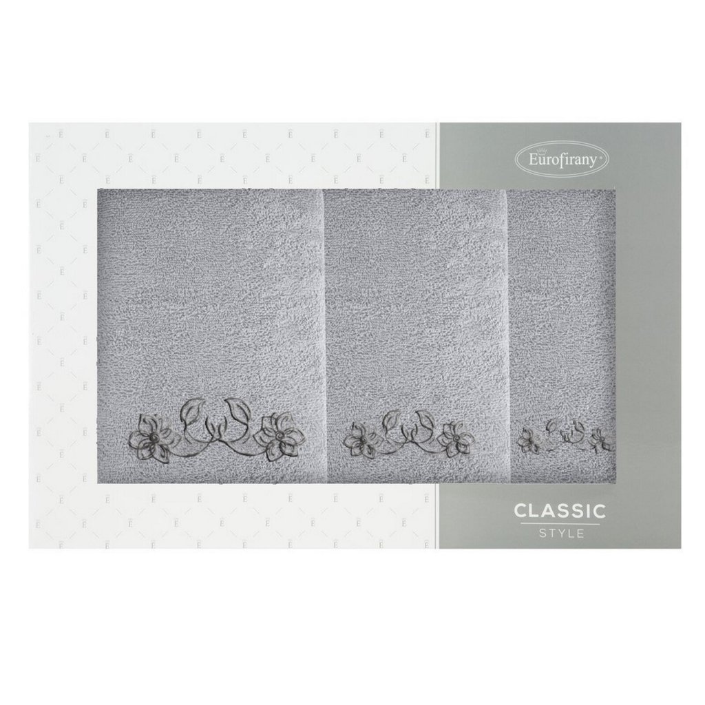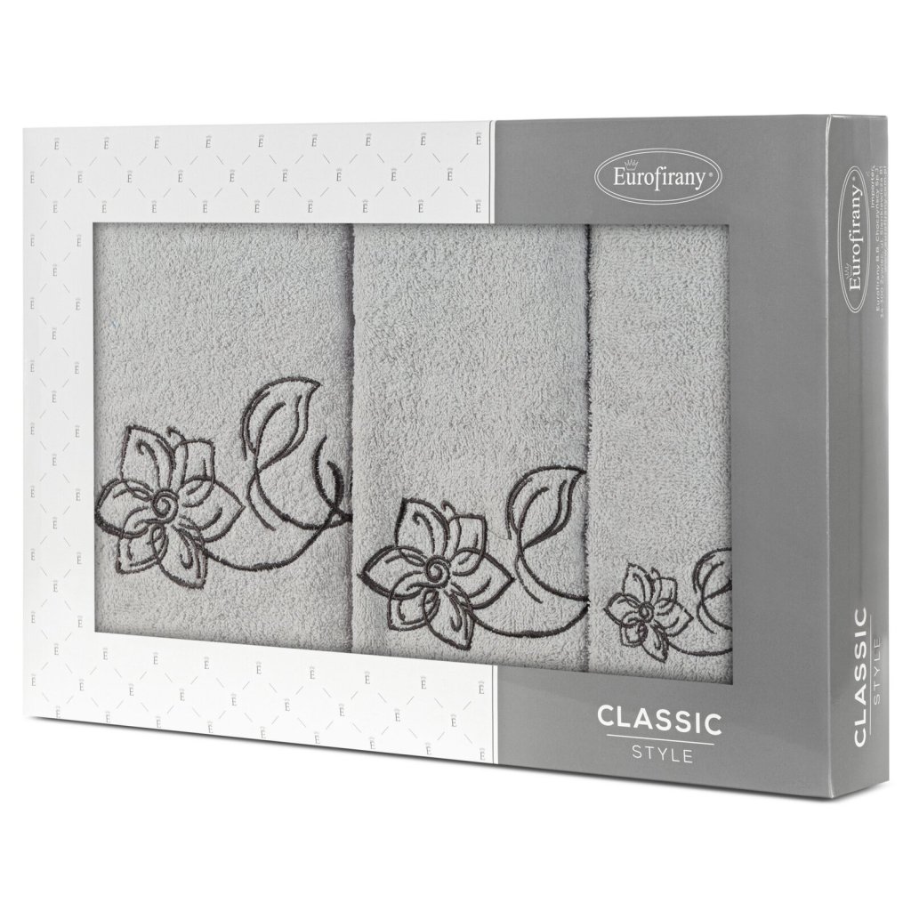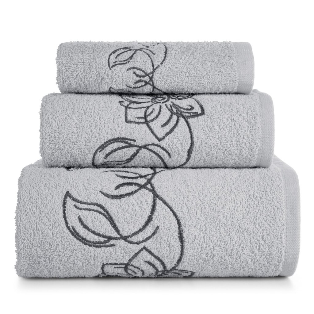 Elegantní sada ručníků LILA s jemnou květinovou výšivkou je ideální volbou. Je vyrobena ze 100% bavlněného froté s certifikací OEKO-TEX® Standard 100. Ručníky vynikají měkkostí a vysokou savostí. Jemná výšivka a estetické balení v kartonové krabici činí z této sady originální dárek. Sada obsahuje 3 ks ručníků o rozměrech: 70x140 cm - 1 ks, 50x90 cm - 1 ks, 30x50 cm - 1 ks , barva: stříbrná, gramáž: 400 GSM, složení: 100% bavlna.Doplňkové parametry