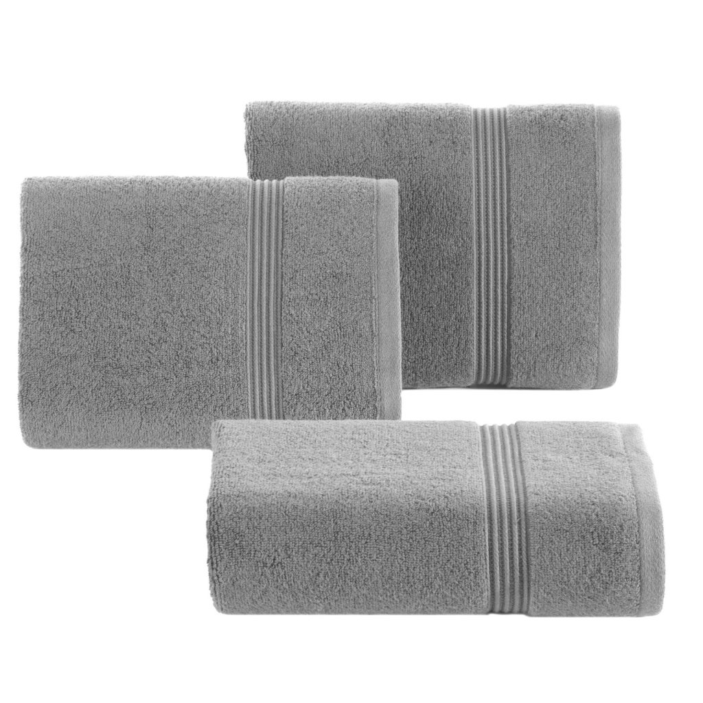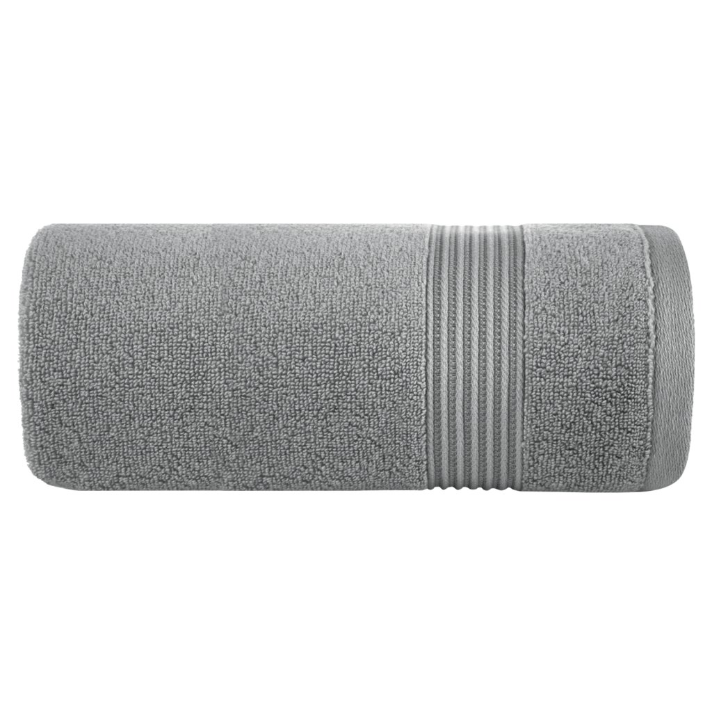 Ručník z měkké a savé bavlněné tkaniny s froté vazbou, zdobený barevným lemem ve stylu bastingu. Šířka: 30 cm, délka: 50 cm, barva: stříbrná, gramáž: 550 GSM, složení: 75 % bavlna, 25 % modal; ozdobná část: 80 % bavlna, 20 % viskóza.Doplňkové parametry
