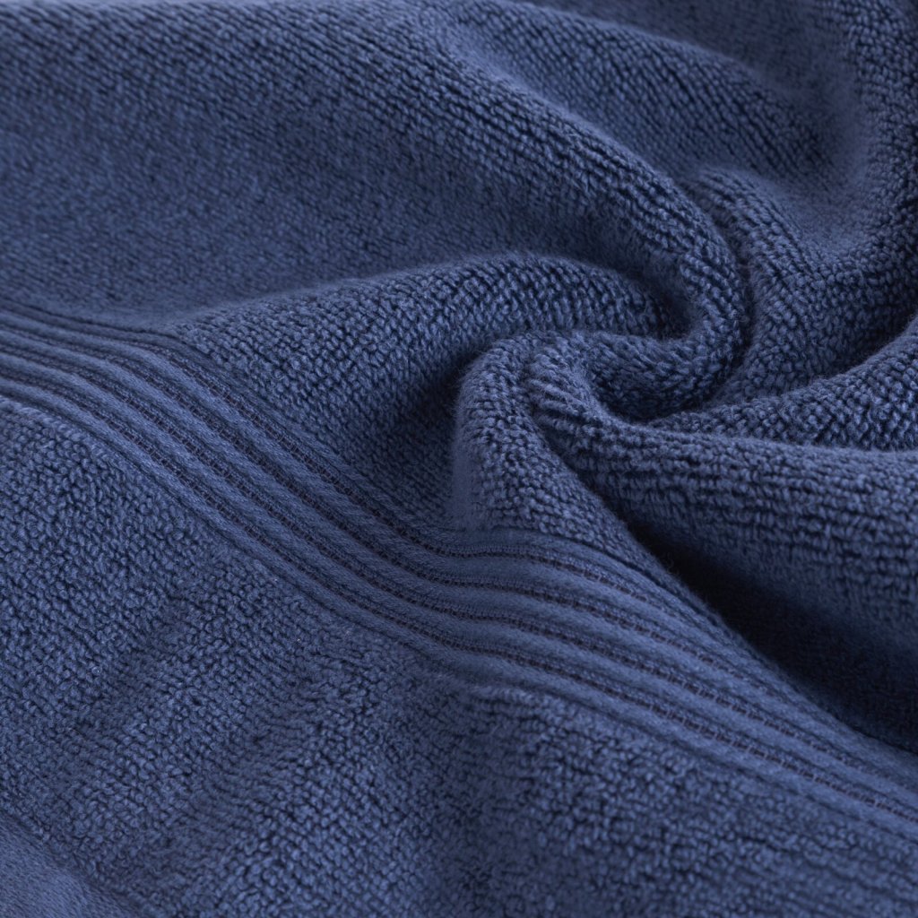 Ručník z měkké a savé bavlněné tkaniny s froté vazbou, zdobený barevným lemem ve stylu bastingu. Šířka: 30 cm, délka: 50 cm, barva: tmavě modrá, gramáž: 550 GSM, složení: 75 % bavlna, 25 % modal; ozdobná část: 80 % bavlna, 20 % viskóza.Doplňkové parametry