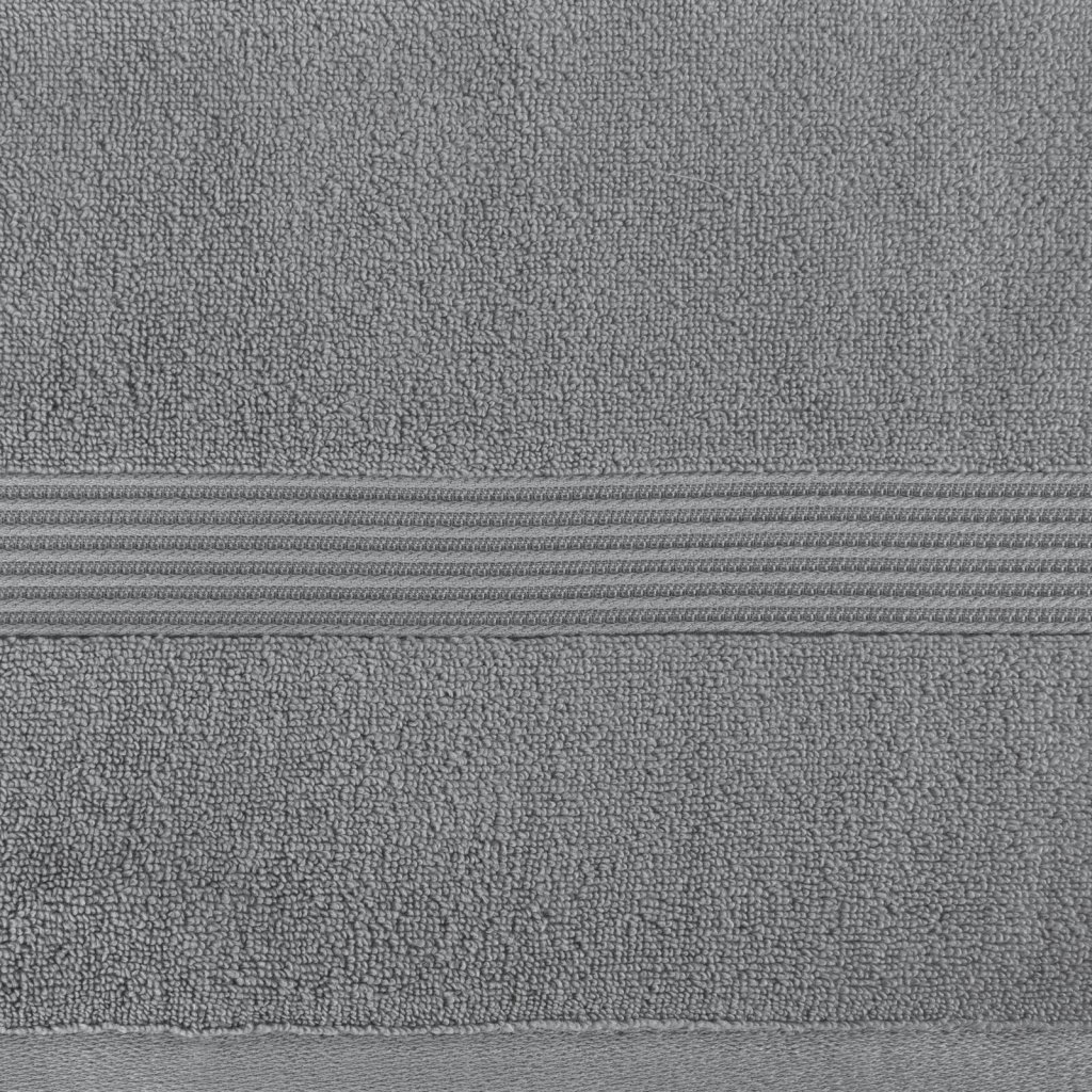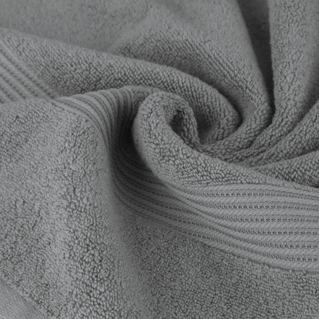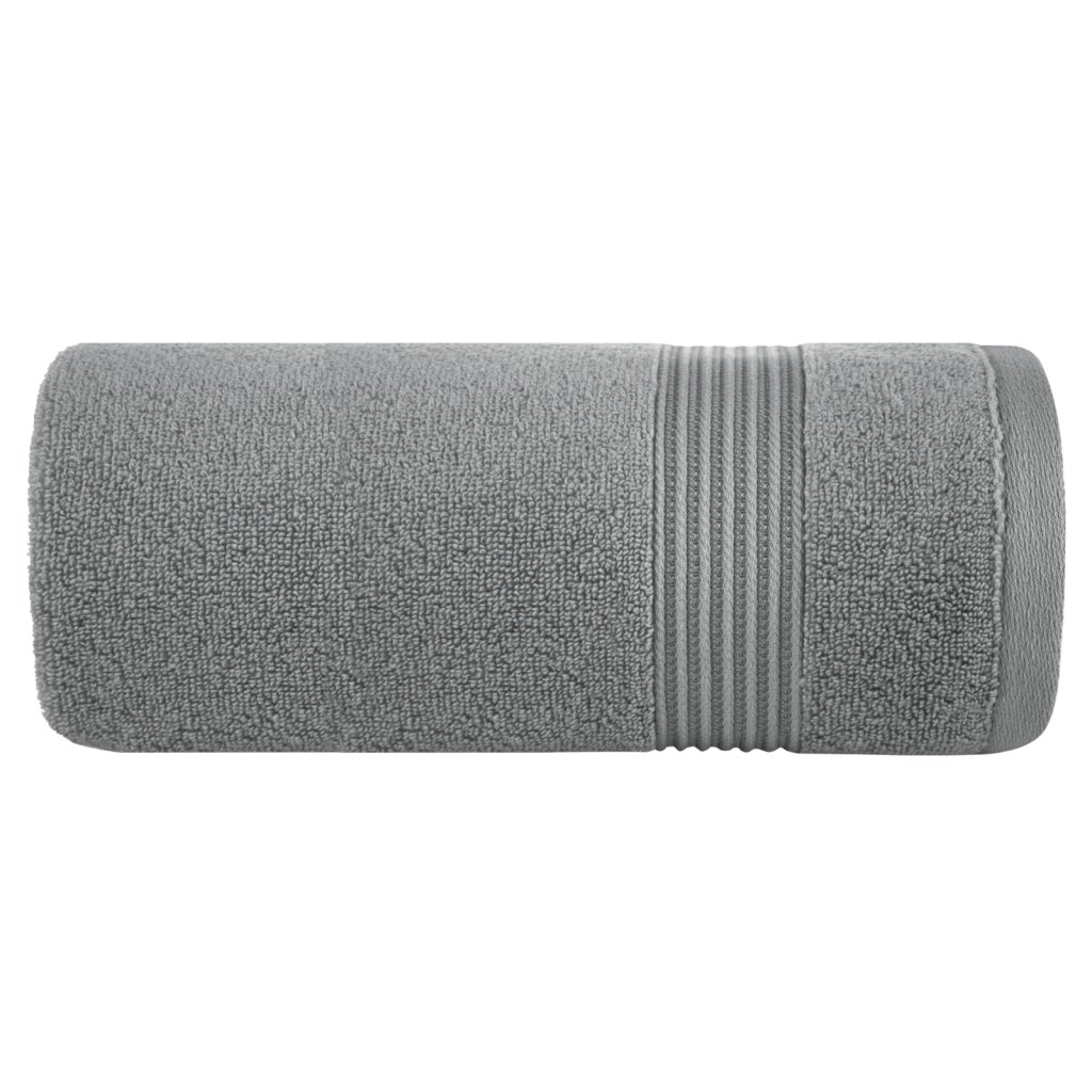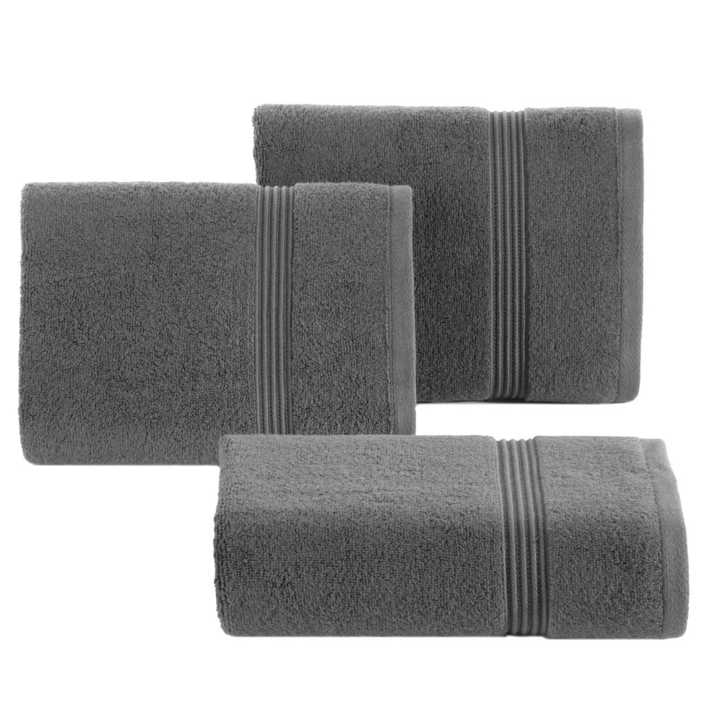 Ručník z měkké a savé bavlněné tkaniny s froté vazbou, zdobený barevným lemem ve stylu bastingu. Šířka: 30 cm, délka: 50 cm, barva: tmavě šedá, gramáž: 550 GSM, složení: 75 % bavlna, 25 % modal; ozdobná část: 80 % bavlna, 20 % viskóza.Doplňkové parametry
