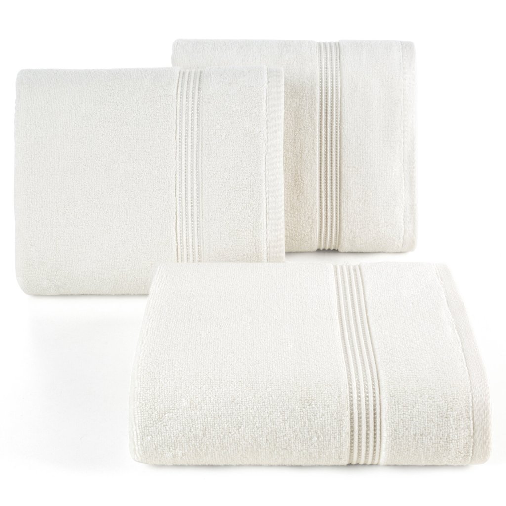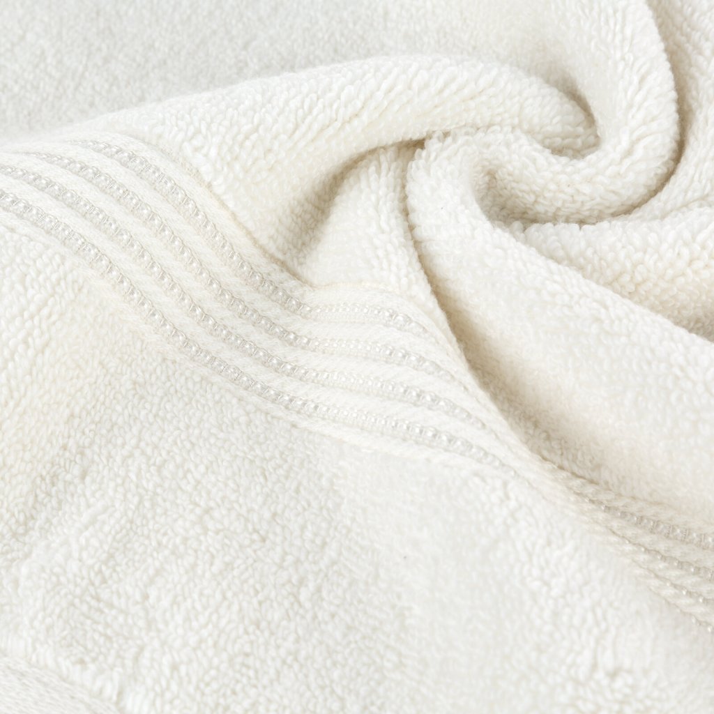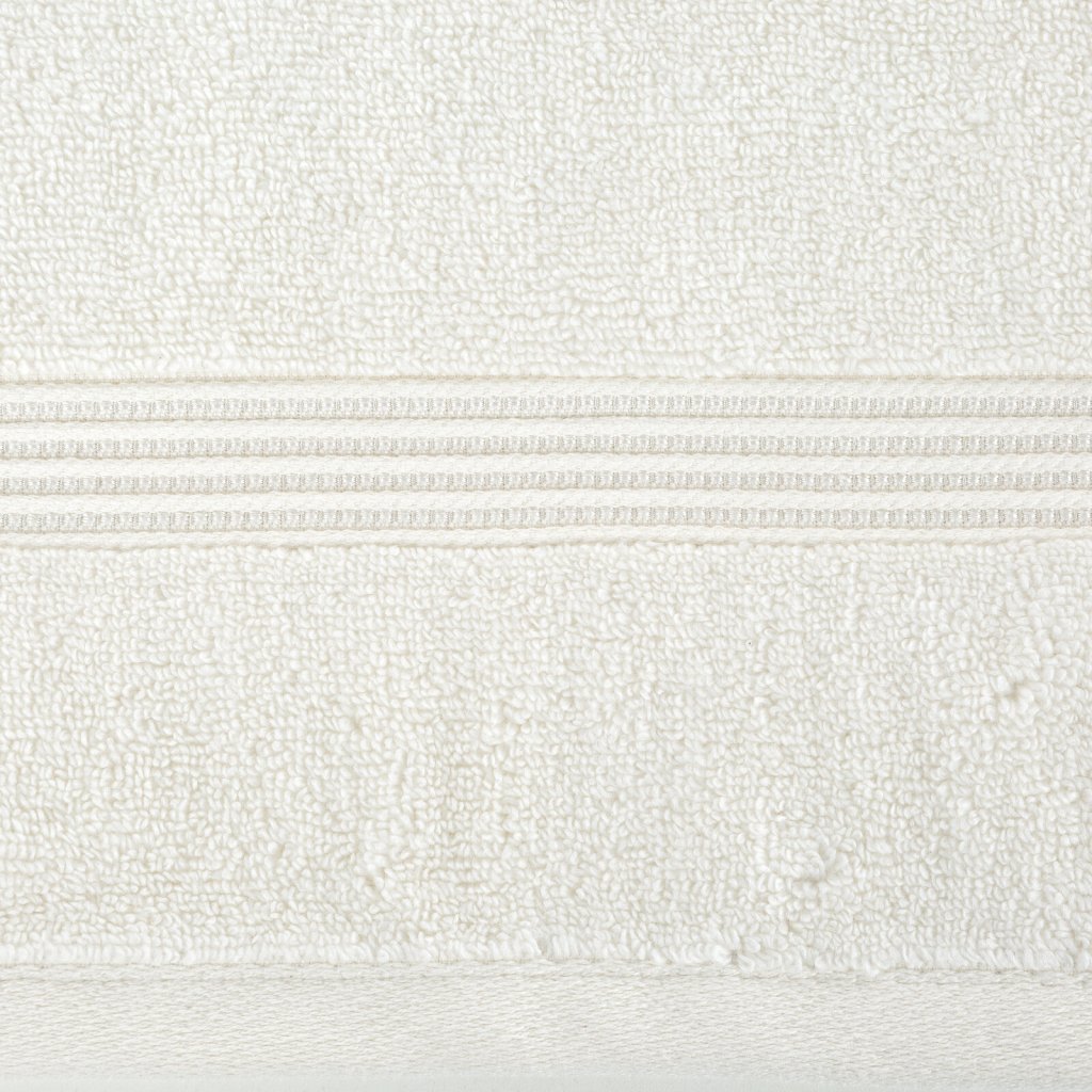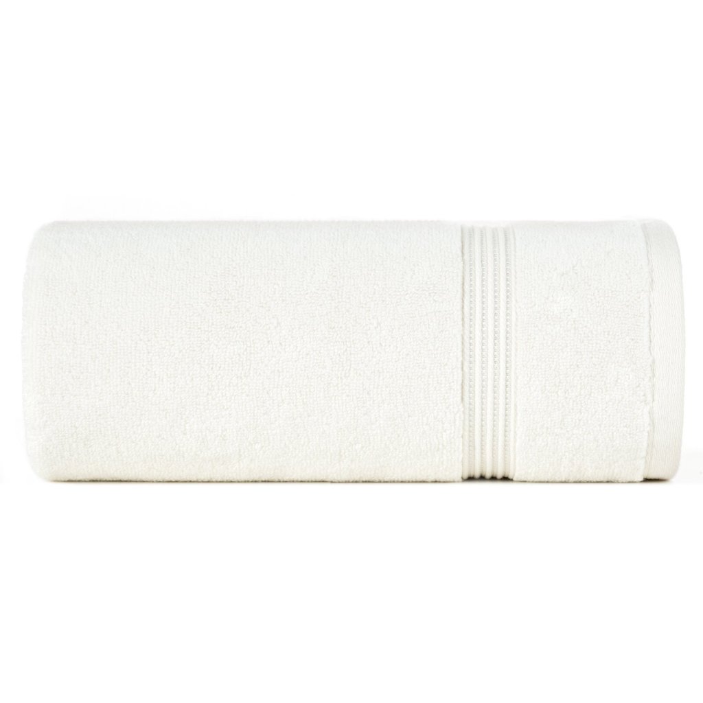 Ručník z měkké a savé bavlněné tkaniny s froté vazbou, zdobený barevným lemem ve stylu bastingu. Šířka: 50 cm, délka: 90 cm, barva: krémová, gramáž: 550 GSM, složení: 75 % bavlna, 25 % modal; ozdobná část: 80 % bavlna, 20 % viskóza.Doplňkové parametry