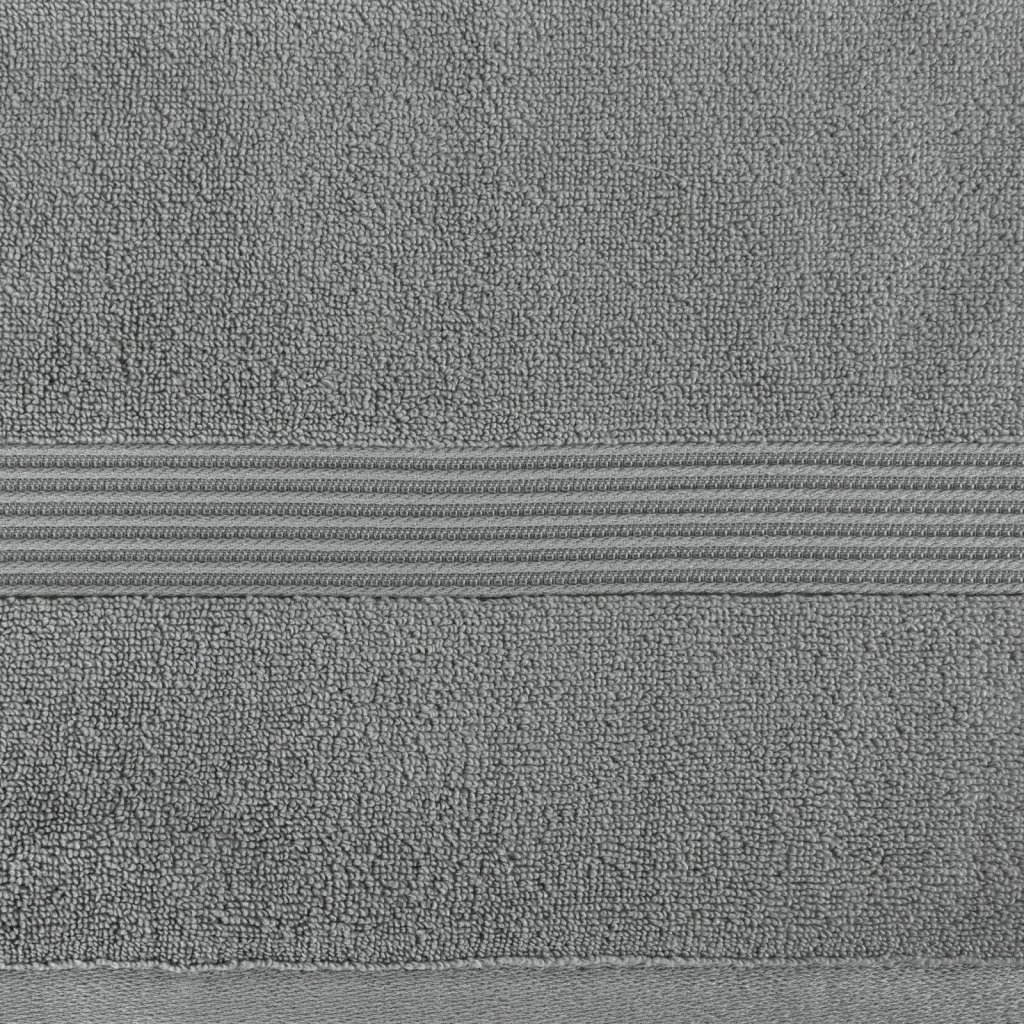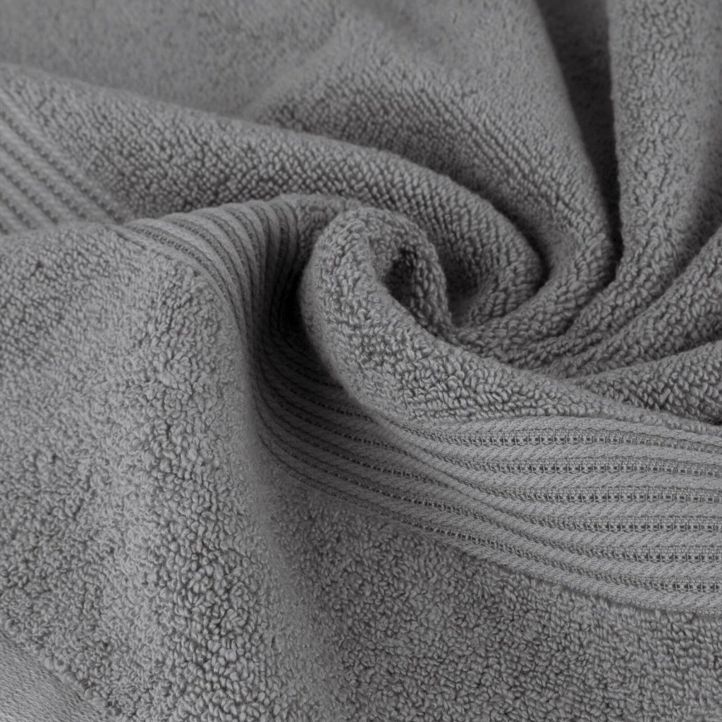 Ručník z měkké a savé bavlněné tkaniny s froté vazbou, zdobený barevným lemem ve stylu bastingu. Šířka: 50 cm, délka: 90 cm, barva: stříbrná, gramáž: 550 GSM, složení: 75 % bavlna, 25 % modal; ozdobná část: 80 % bavlna, 20 % viskóza.Doplňkové parametry