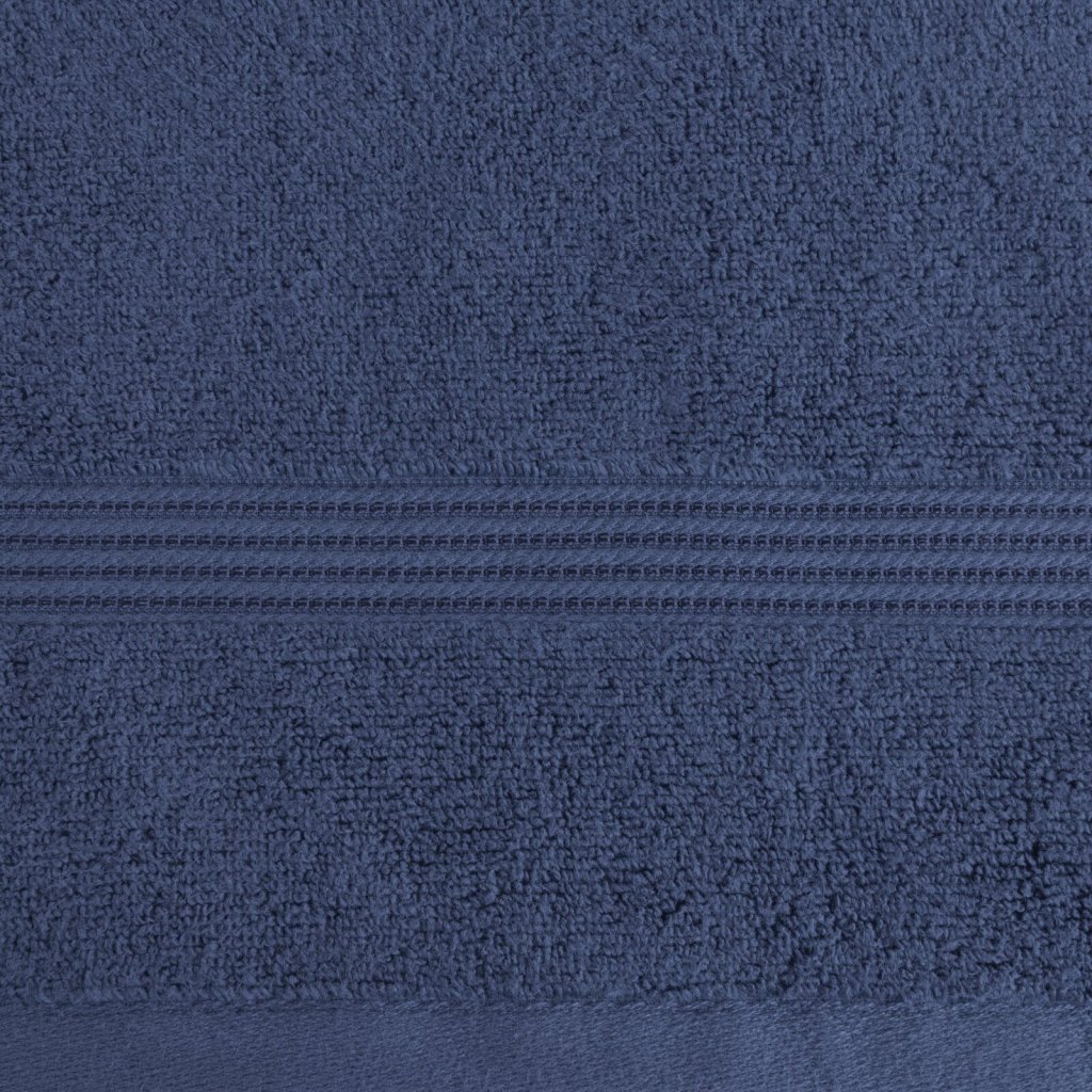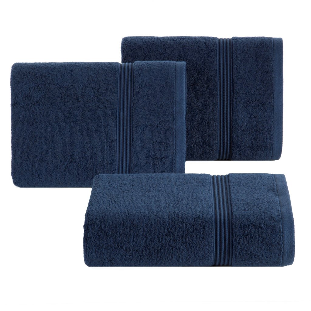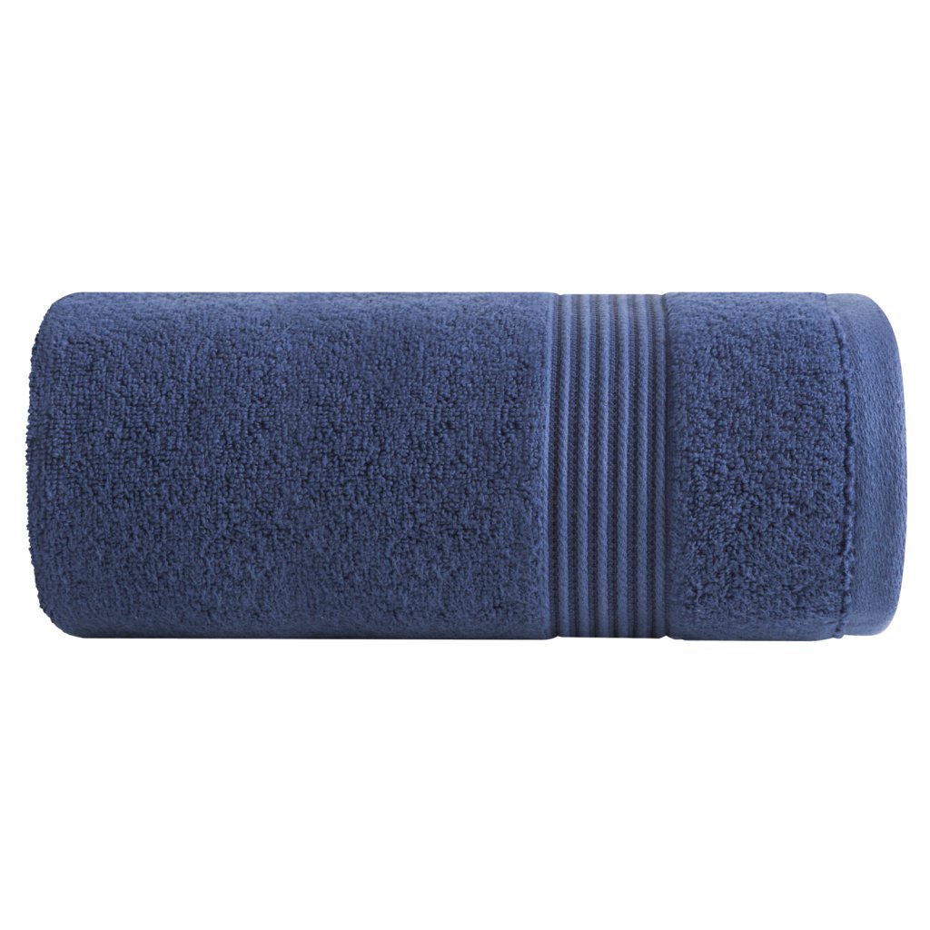 Ručník z měkké a savé bavlněné tkaniny s froté vazbou, zdobený barevným lemem ve stylu bastingu. Šířka: 50 cm, délka: 90 cm, barva: tmavě modrá, gramáž: 550 GSM, složení: 75 % bavlna, 25 % modal; ozdobná část: 80 % bavlna, 20 % viskóza.Doplňkové parametry