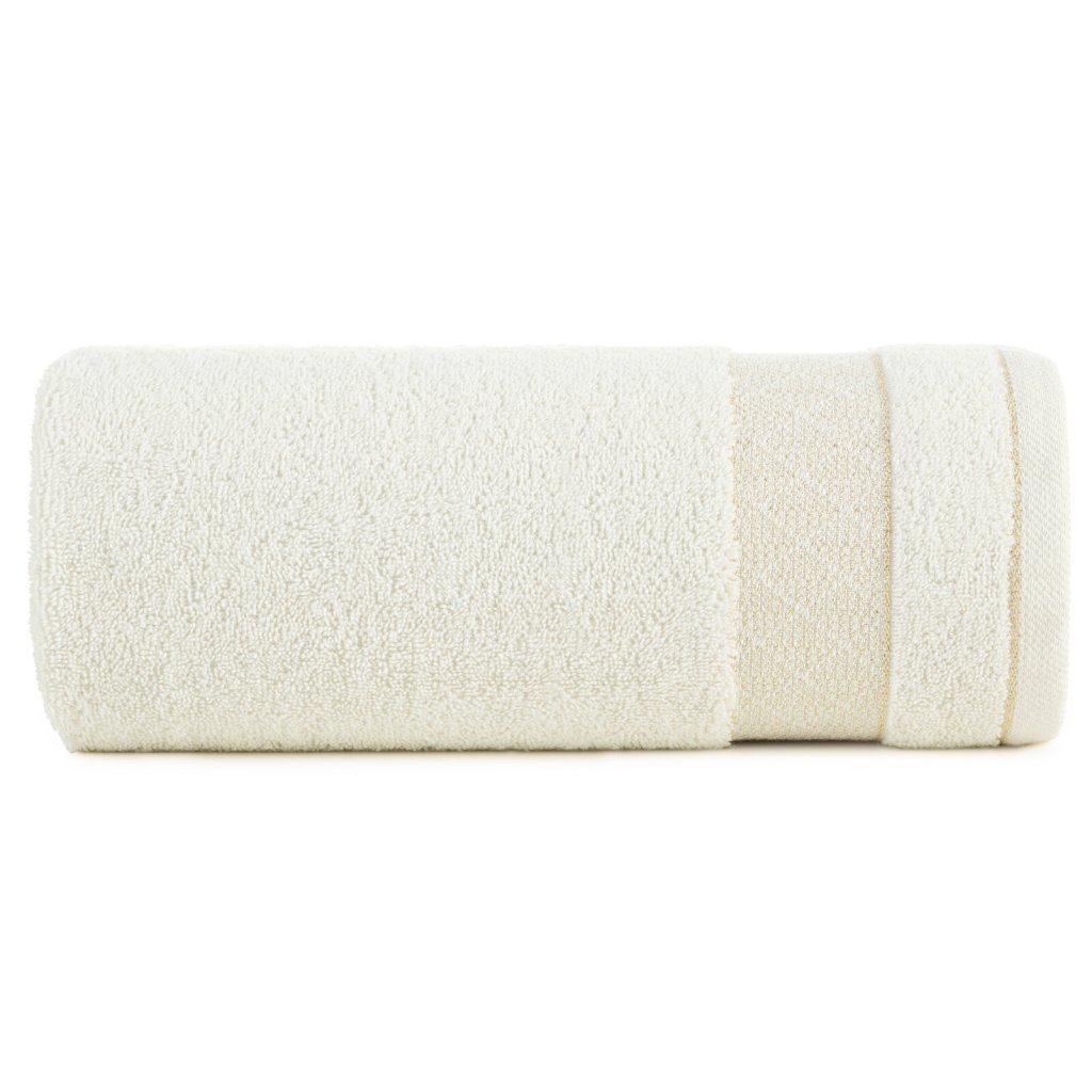 Ručník z měkké a savé bavlněné tkaniny s froté vazbou, zdobený barevným lemem ve stylu bastingu. Šířka: 30 cm, délka: 50 cm, barva: krémová, gramáž: 500 GSM, složení: 100% bavlna; ozdobná část: 50% bavlna, 50% polyester.Doplňkové parametry