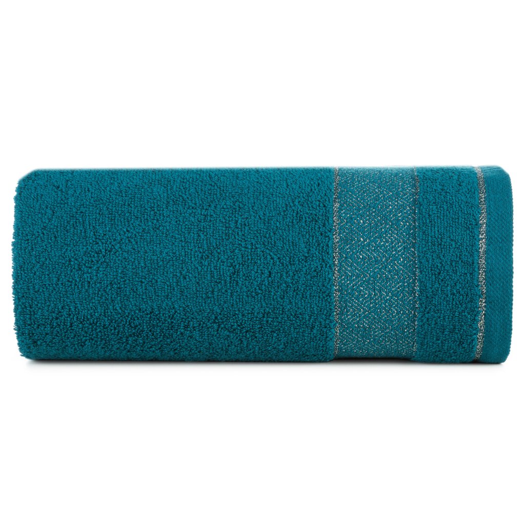 Ručník z měkké a savé bavlněné tkaniny s froté vazbou, zdobený barevným lemem ve stylu bastingu. Šířka: 30 cm, délka: 50 cm, barva: tmavě tyrkysová, gramáž: 500 GSM, složení: 100% bavlna; ozdobná část: 50% bavlna, 50% polyester.Doplňkové parametry