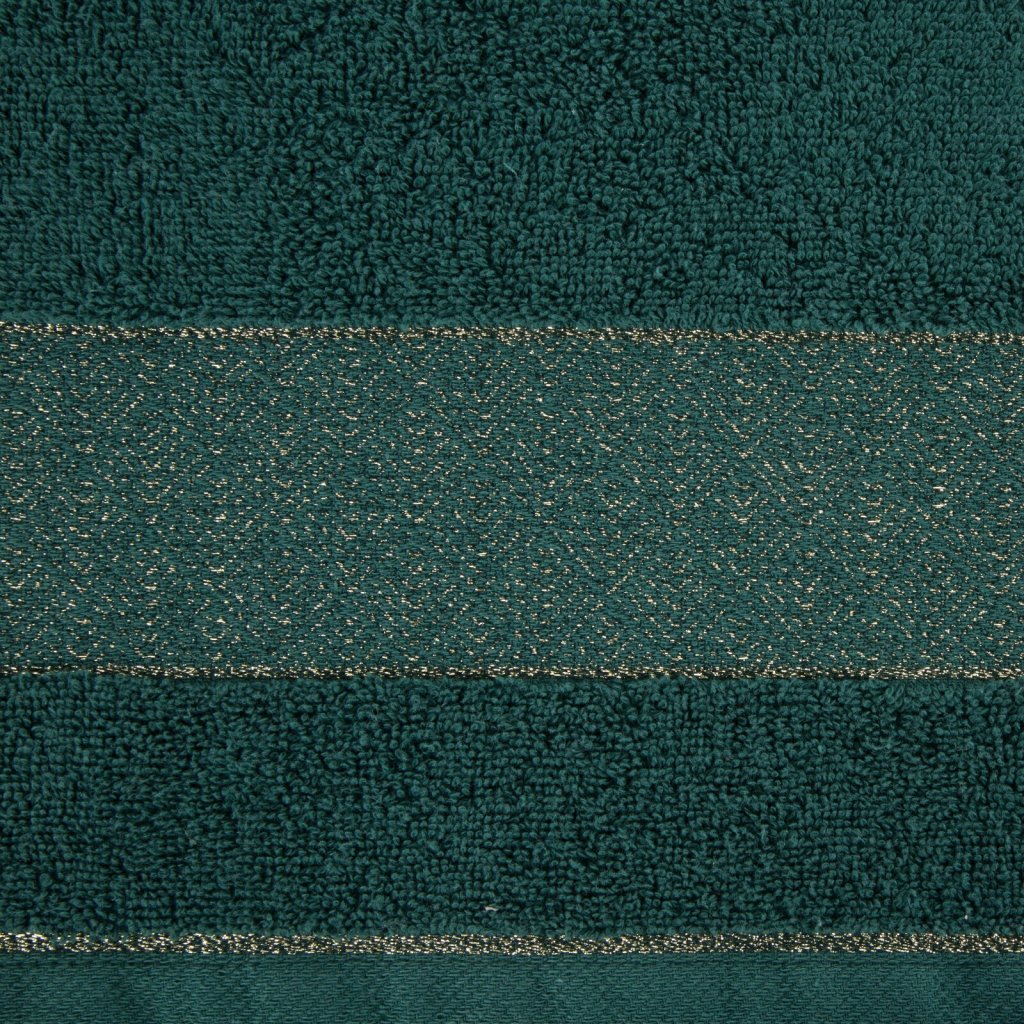 Ručník z měkké a savé bavlněné tkaniny s froté vazbou, zdobený barevným lemem ve stylu bastingu. Šířka: 30 cm, délka: 50 cm, barva: tmavě zelená, gramáž: 500 GSM, složení: 100% bavlna; ozdobná část: 50% bavlna, 50% polyester.Doplňkové parametry