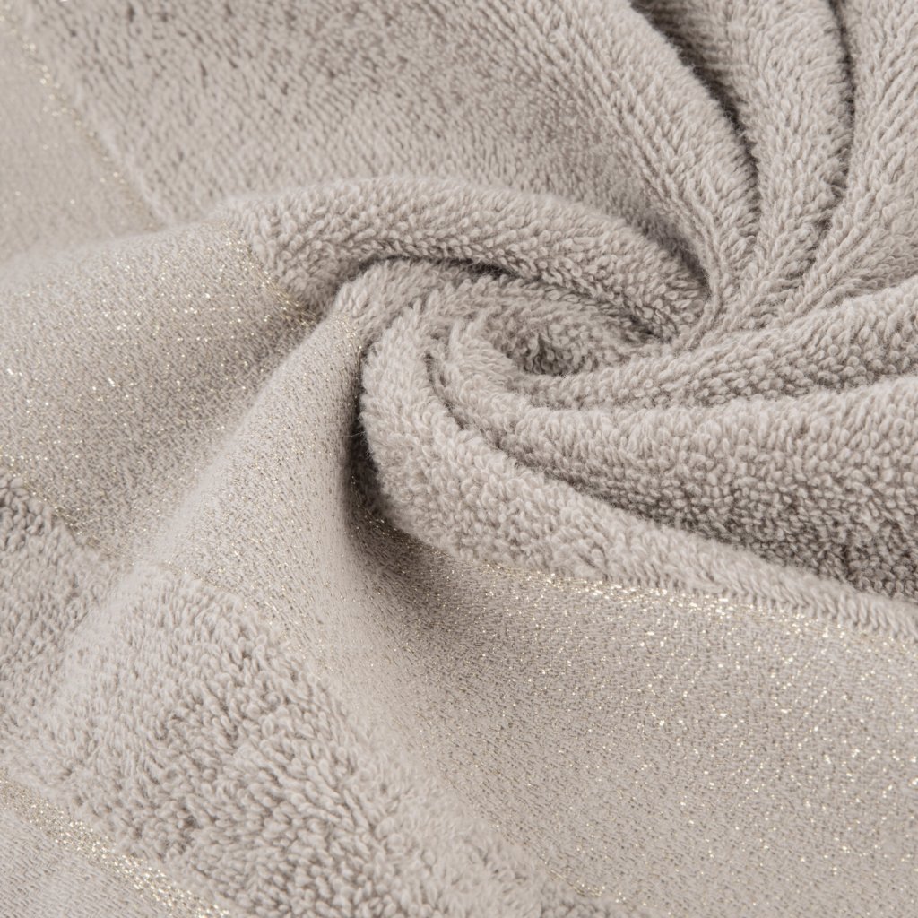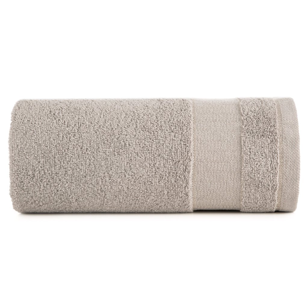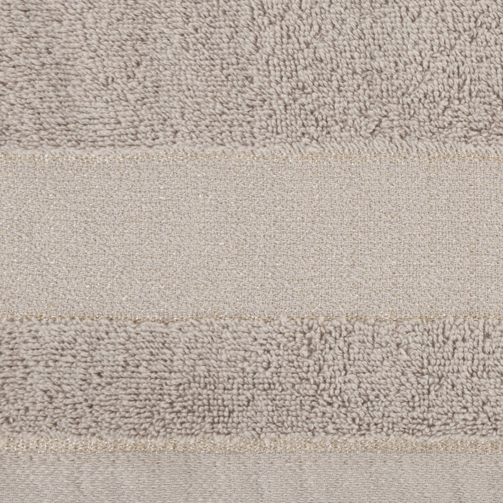Ručník z měkké a savé bavlněné tkaniny s froté vazbou, zdobený barevným lemem ve stylu bastingu. Šířka: 50 cm, délka: 90 cm, barva: béžová, gramáž: 500 GSM, složení: 100% bavlna; ozdobná část: 50% bavlna, 50% polyester.Doplňkové parametry