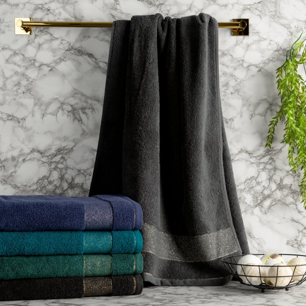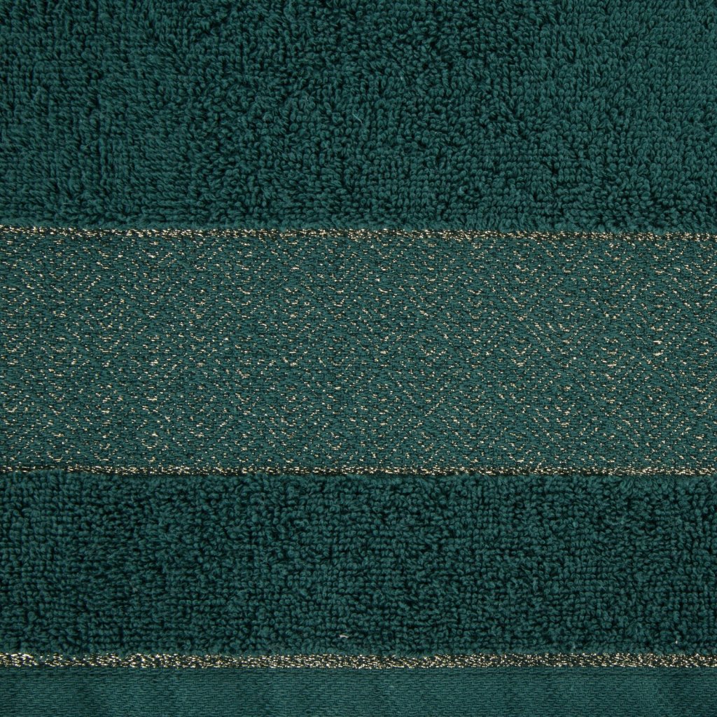 Ručník z měkké a savé bavlněné tkaniny s froté vazbou, zdobený barevným lemem ve stylu bastingu. Šířka: 50 cm, délka: 90 cm, barva: tmavě zelená, gramáž: 500 GSM, složení: 100% bavlna; ozdobná část: 50% bavlna, 50% polyester.Doplňkové parametry